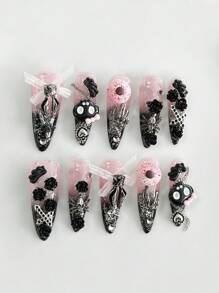 Grunge Punk 10pcs Y2K Baddie Style Black Rose, Skull, Spider, Bunny, Bow, Eye, Cross Handpainted High Quality False Nails + 3pcs Double-Sided Adhesive, Removable & Reusable Glitter Black & Pink Ombre Nail Art Stickers, Suitable For Holidays, Parties, Dancing And Daily Wear, Halloween