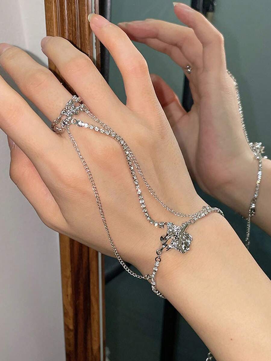 Grunge Punk 1pc Full Diamond Inlaid Chain With Ring Attached Bracelet