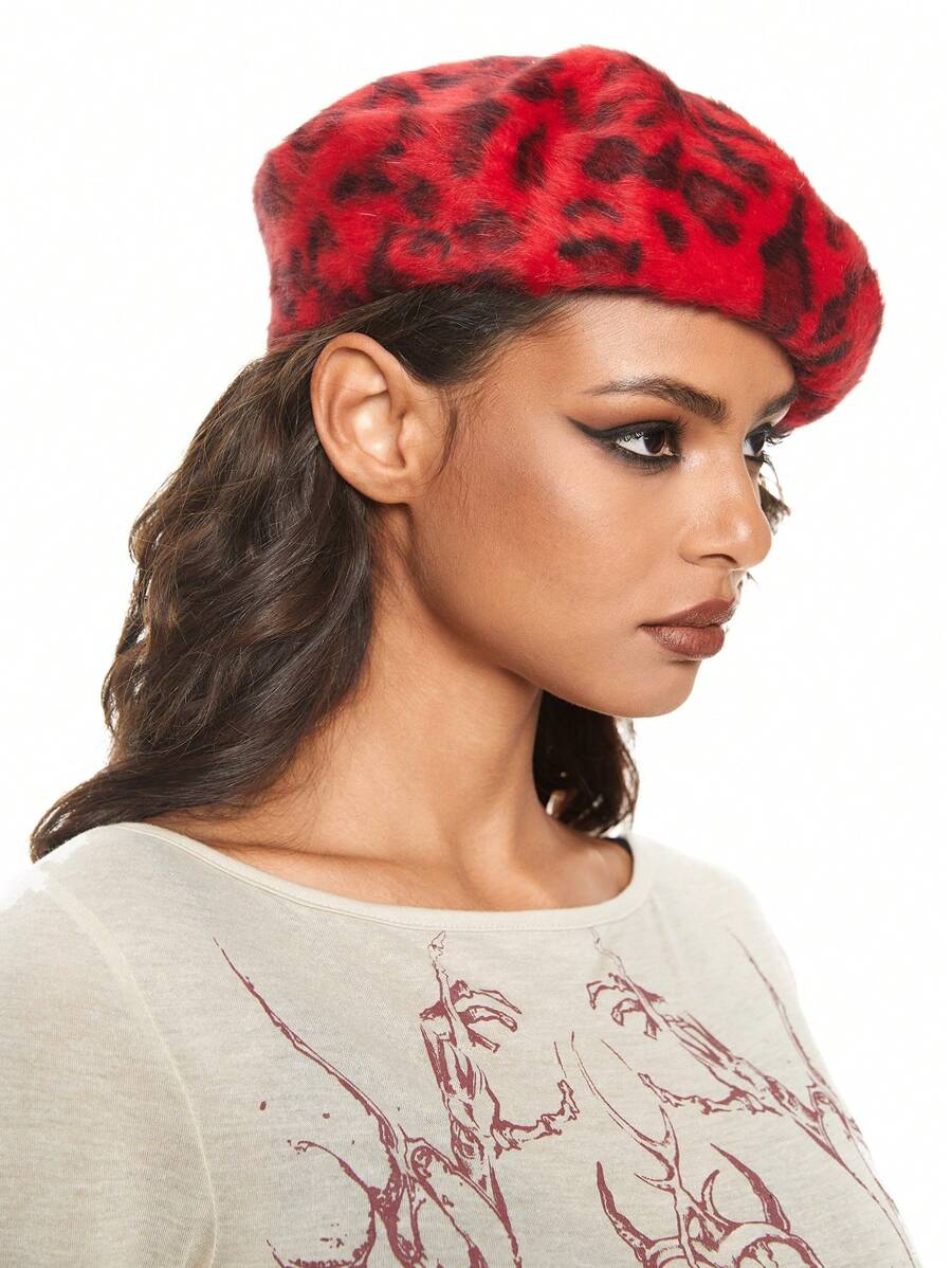 Grunge Punk 1pc Red Leopard Print Beret Hat, Fashion Fuzzy Hat For Women, Y2K Accessory