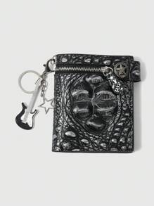 Grunge Punk 1pc Vintage Punk Rock Heavy Metal Silver 3D Crocodile Embossed Five-Pointed Star Accent Zip Wallet, With Y2K Music Festival Metal Guitar Star Keychain Pendant