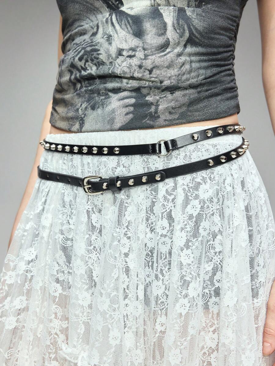 Grunge Punk 1pc Women's Punk Style Double-Circle Waist Belt, Bucket Nail Decor Super Long Thin Casual Versatile Rivet Leather Belt