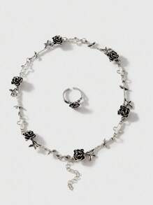 Grunge Punk 2pcs Vintage Rose Flower Cross Necklace & Ring Set