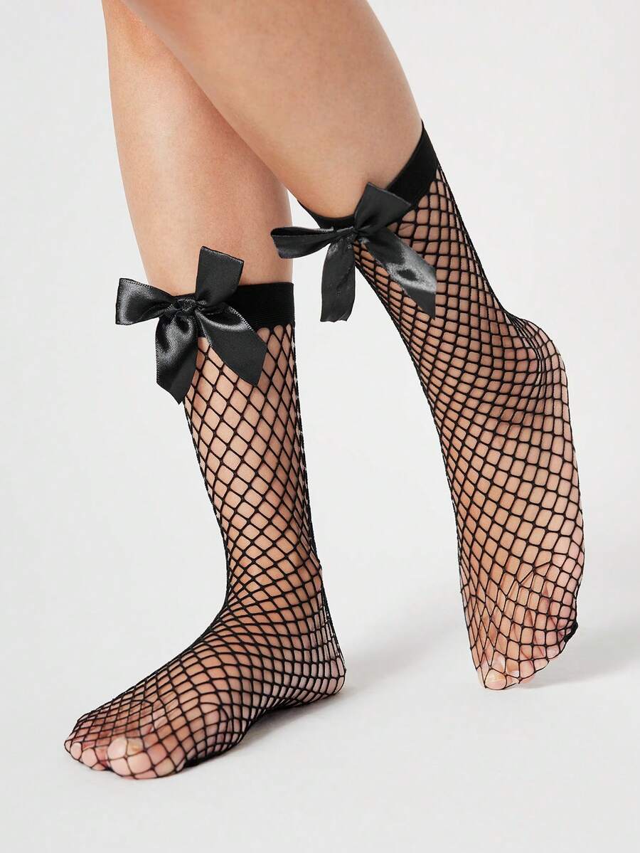 Grunge Punk 3 Pairs Minimalistic Mesh Socks In Different Lengths, With Black Bow And Solid Color Combination, Versatile College Style