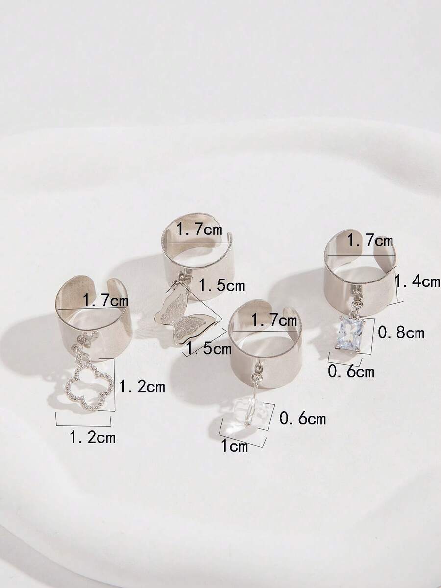 Grunge Punk 4pcs Jewelry Set With Alloy Silver Rings, Butterfly Design Pendant & Rhinestone Decor Rings, Women's Dating Gift