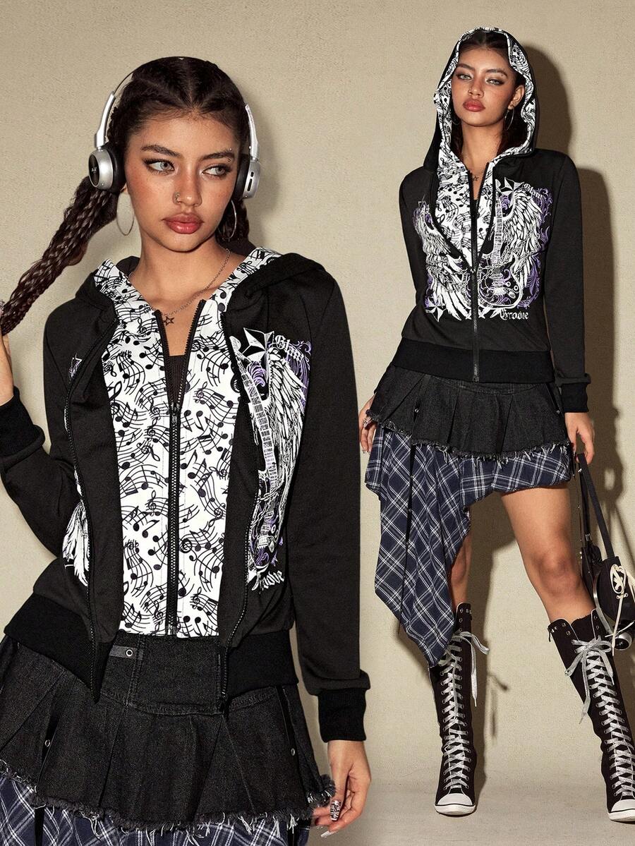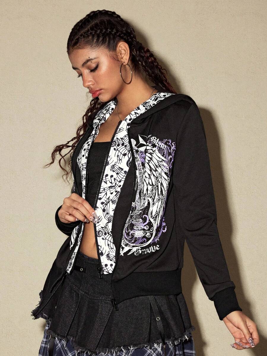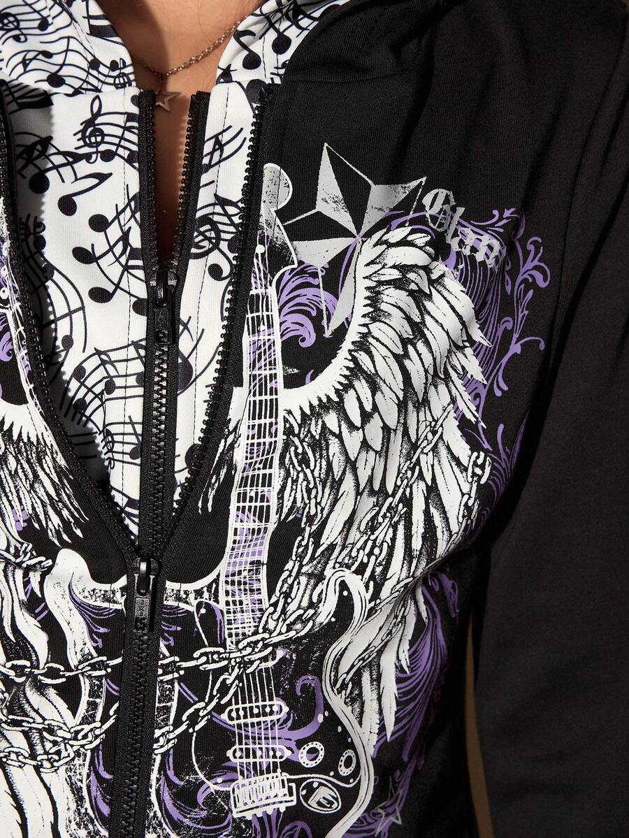 Grunge Punk American Music Note & Electric Guitar Print Pullover Sweatshirt For Women