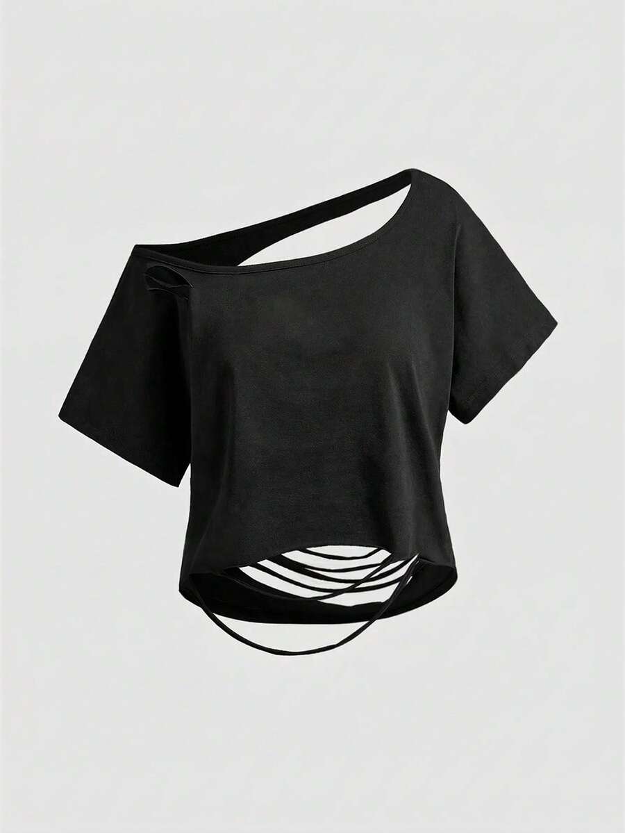 Grunge Punk Asymmetric Shoulder Ripped Open Back Loose Cropped T-Shirt