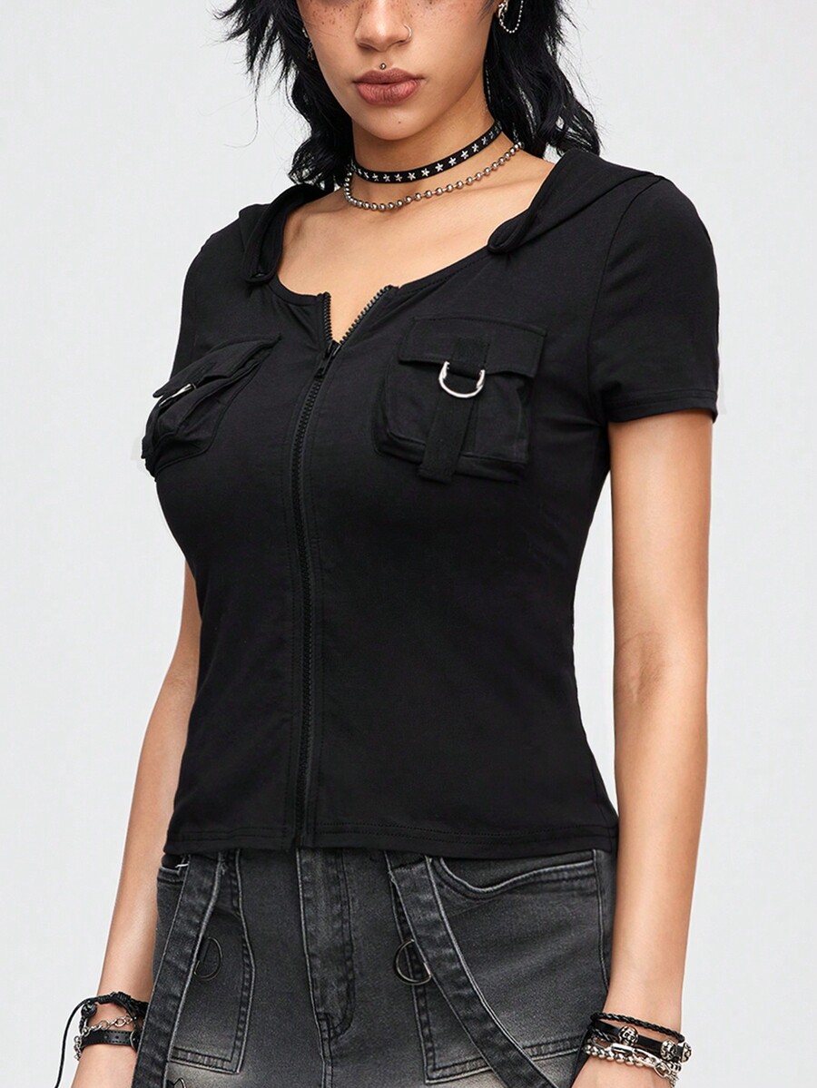 Grunge Punk Casual Cool All-Match Workwear Style Short Sleeve Women T-Shirt With Hood, Button, Pocket And Knitted Elastic Design For Slim Fit
