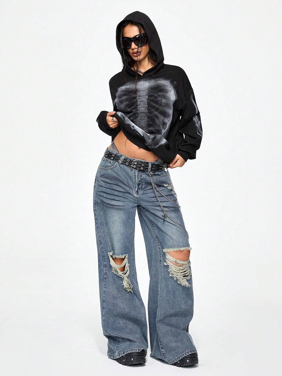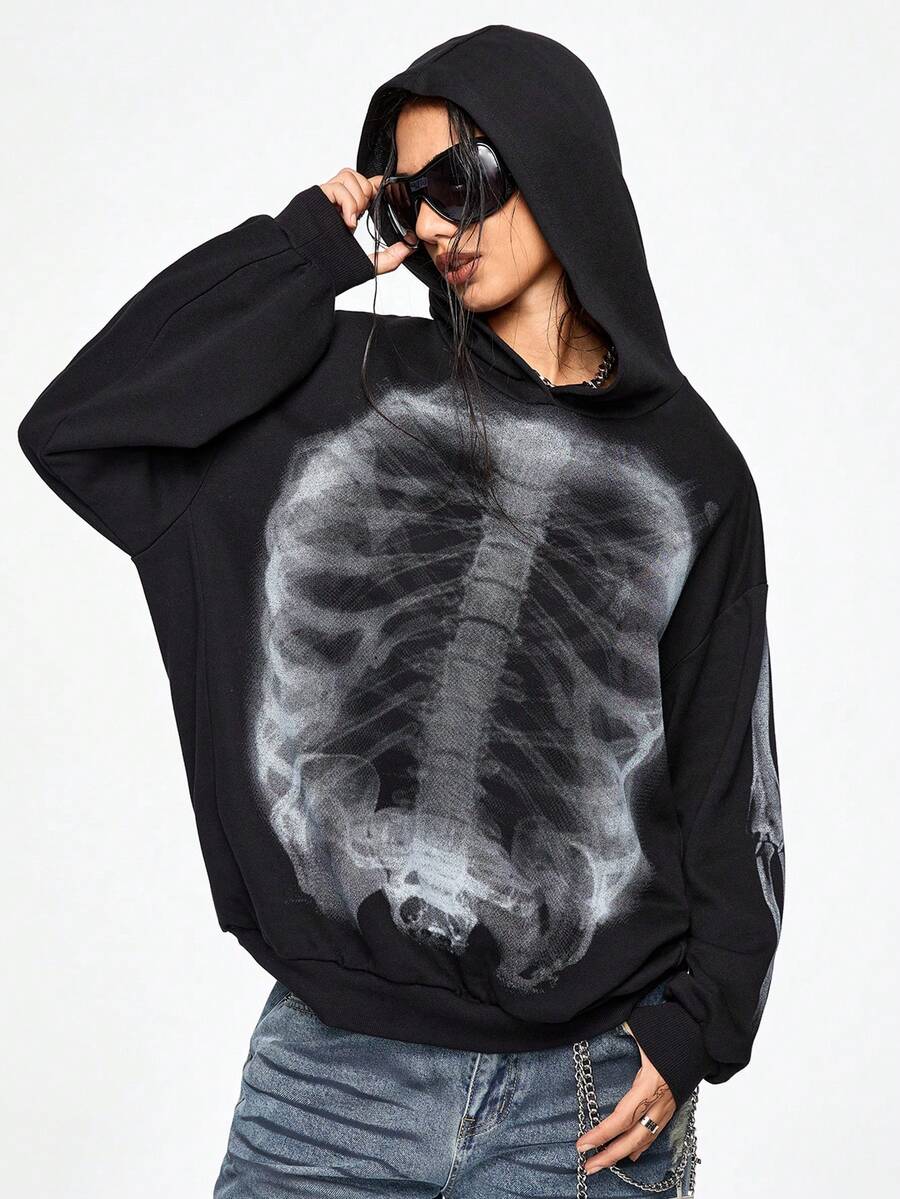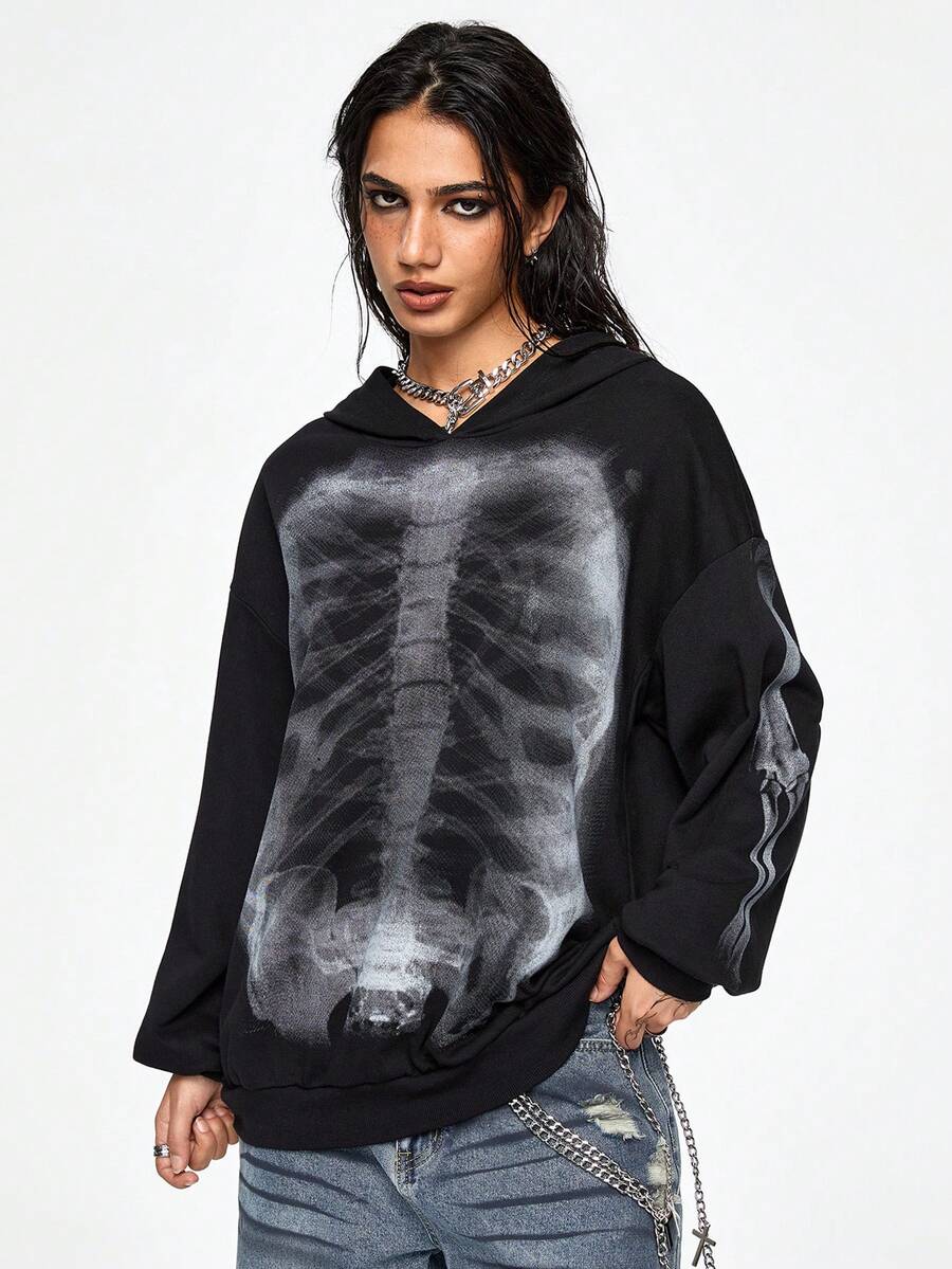 Grunge Punk Casual Streetwear Aesthetic Film Skeleton X-Ray Graphic Oversized Drop Shoulder Women Hoodie