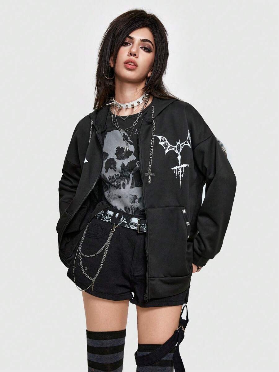 Grunge Punk Cross Print Studded Zip Up Hoodie