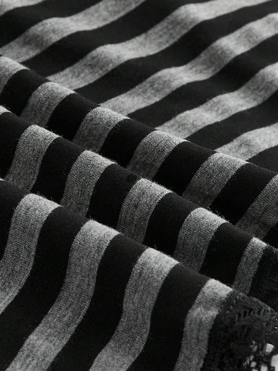 Grunge Punk Cute Retro Striped Contrast Lace Trim Cap Sleeve A-Line Blouse