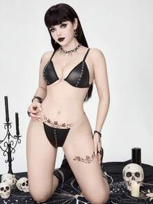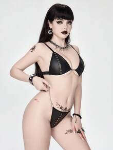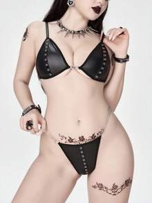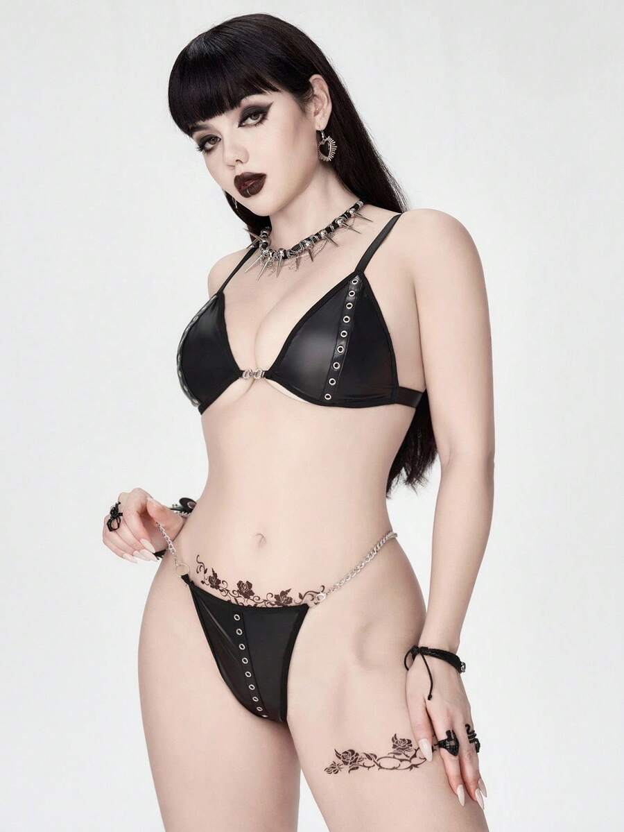 Grunge Punk Dark Punk Eyelet Strap Triangle Cup Bra And Thong Lingerie Set, Sexy