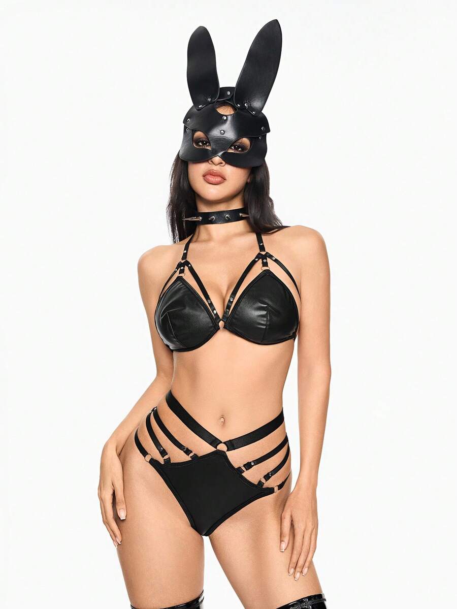 Grunge Punk Dark Punk Eyelet Strap Triangle Cup Bra & Panty Sexy Lingerie Set