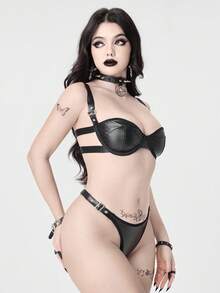 Grunge Punk Dark Punk PU Adjustable Hook Underwire Bra & Panty Sexy Lingerie Set