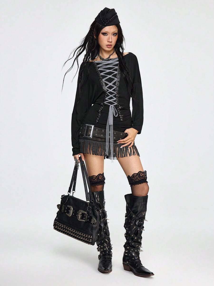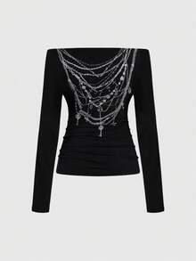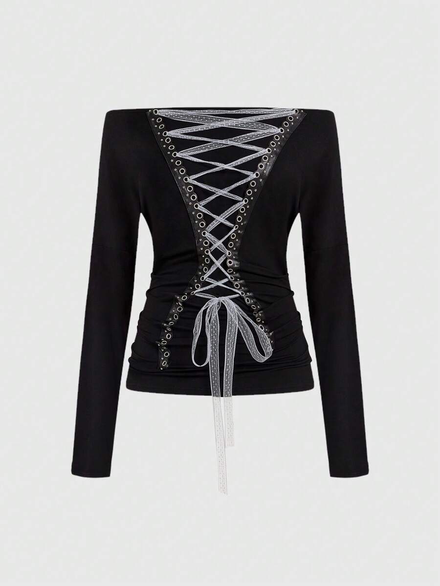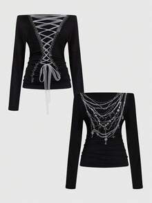 Grunge Punk Dark Punk Print Off-Shoulder Long Sleeve T-Shirt With Tie, Versatile Layering Top