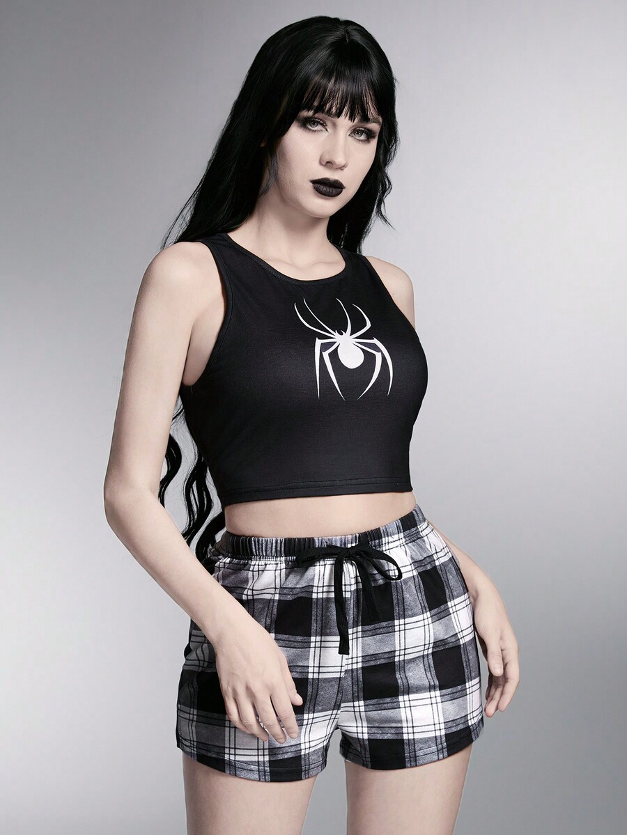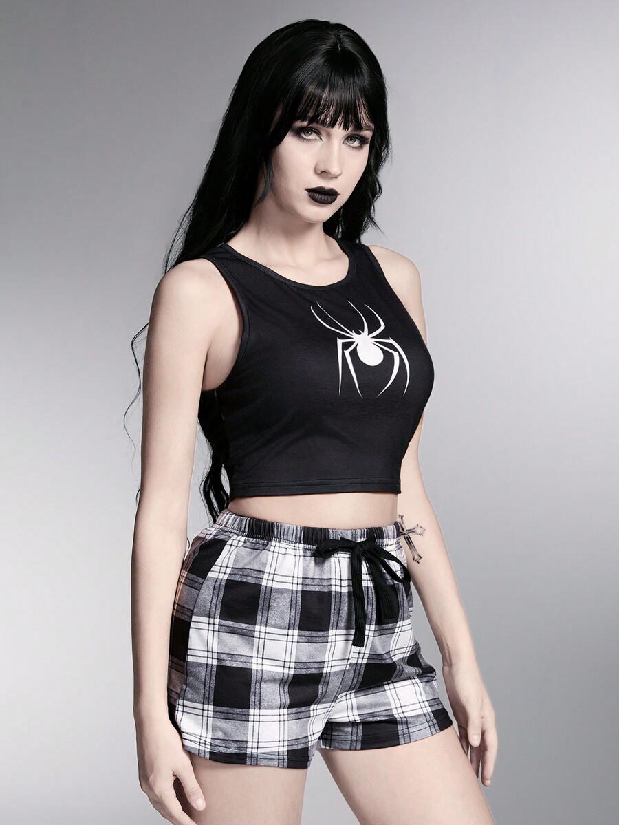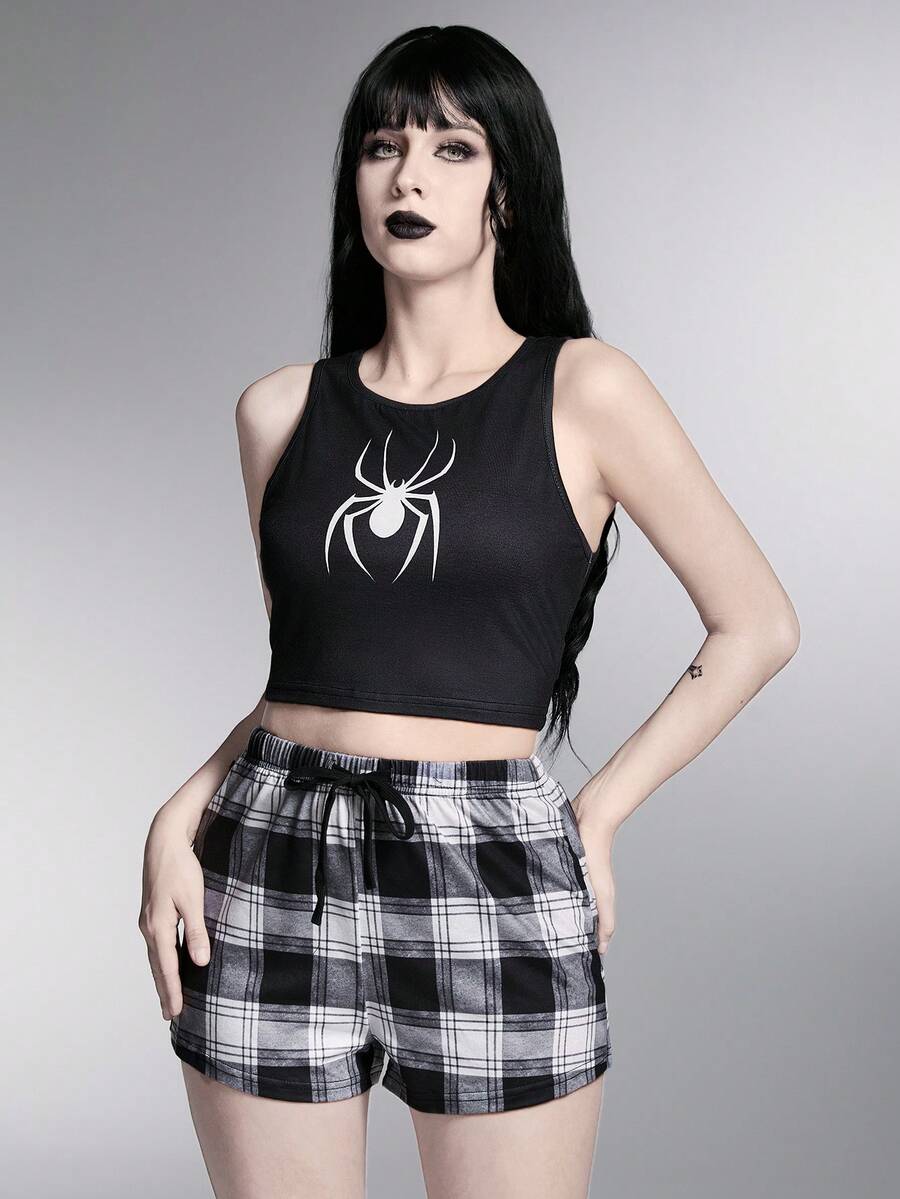 Grunge Punk Dark Punk Rock Spider Printed Vest & Plaid Shorts Casual Sleepwear Set, School
