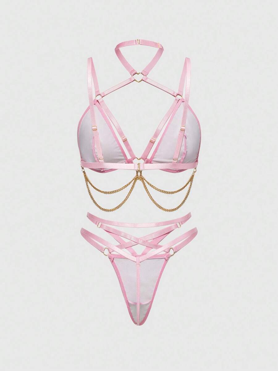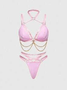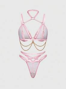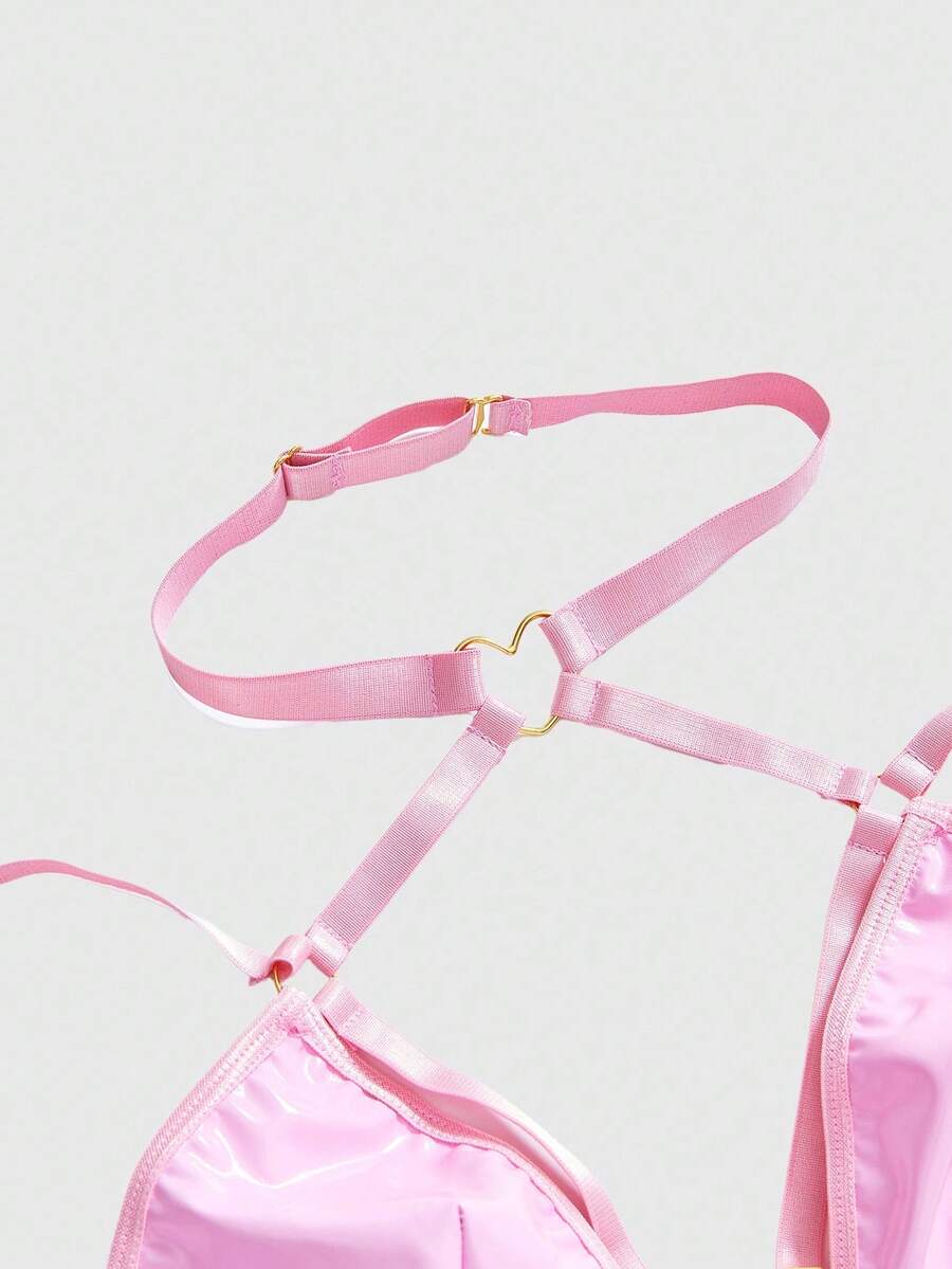 Grunge Punk Dark Street Punk Pink Punk PU Triangle Cup Bra & Thong Sexy Lingerie Set