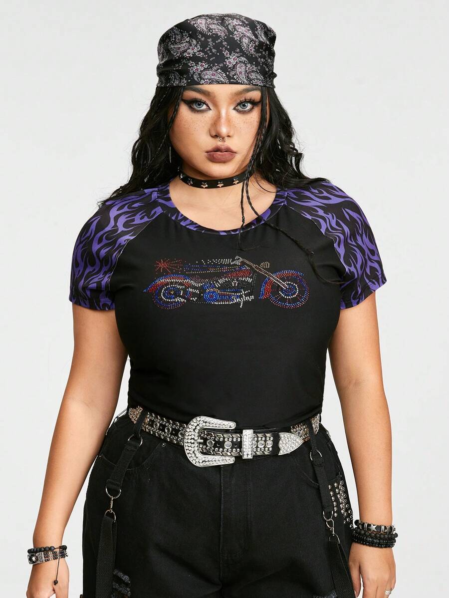 Grunge Punk Fashionable Plus Size Women's Flame Printed Rhinestone Decor Tight T-Shirt With Raglan Sleeve For Motorcycle Lovers