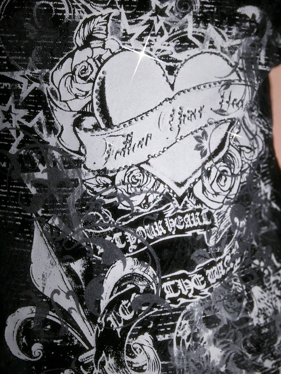Grunge Punk Fashionable Punk Print Lace Patchwork Pleated Side Off Shoulder Strap Mini Dress