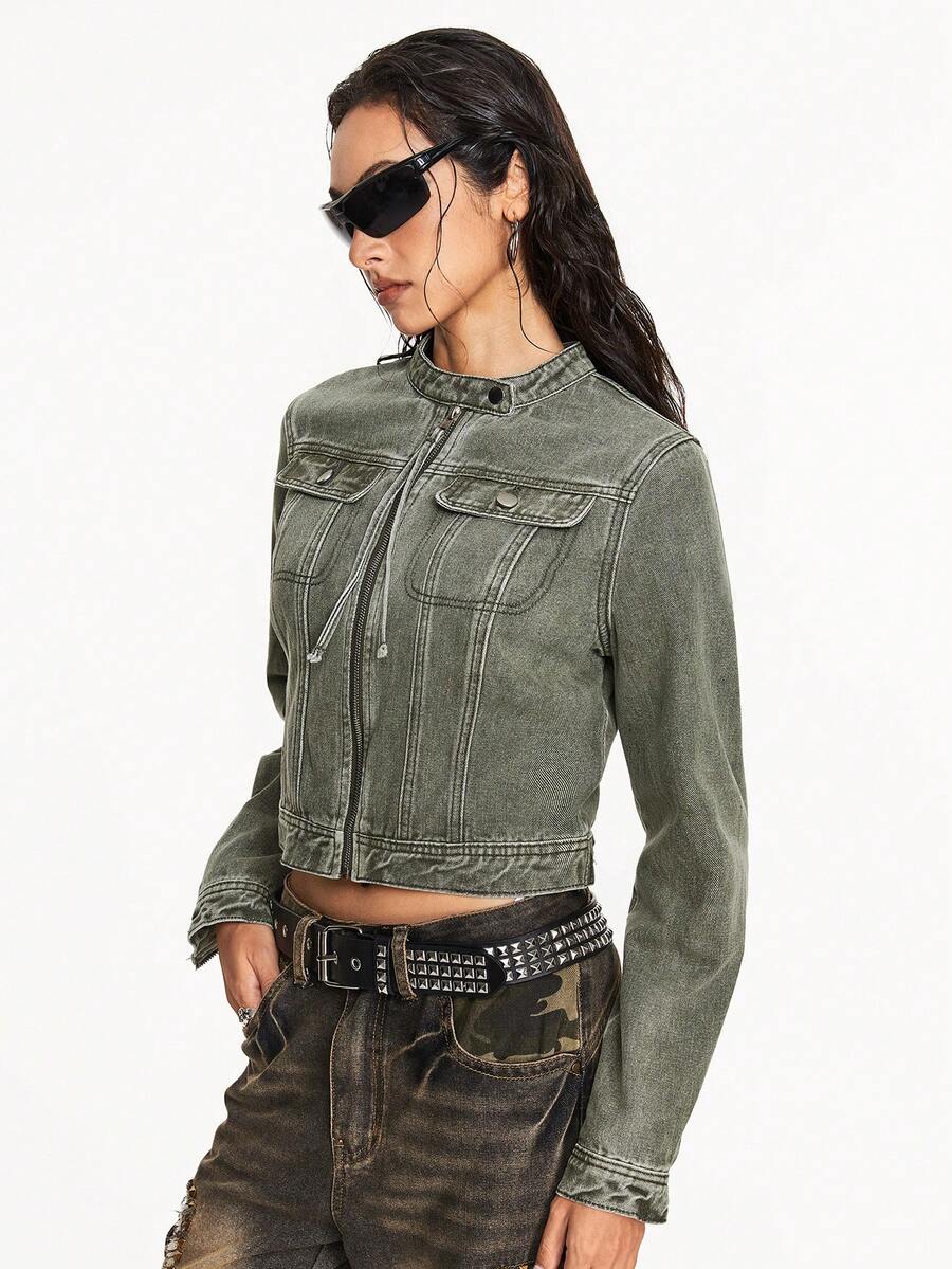 Grunge Punk Front Zipper Pocket Long Sleeve Outdoor Motorcycle Vintage Distressed Fitted Short Denim Jacket