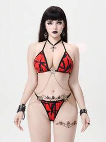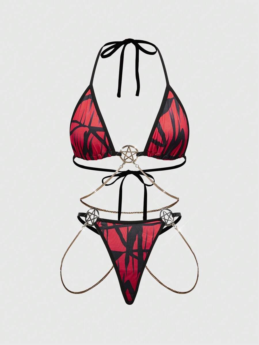 Grunge Punk Gothic Hexagram Metal Ring Chain Triangle Bra Set