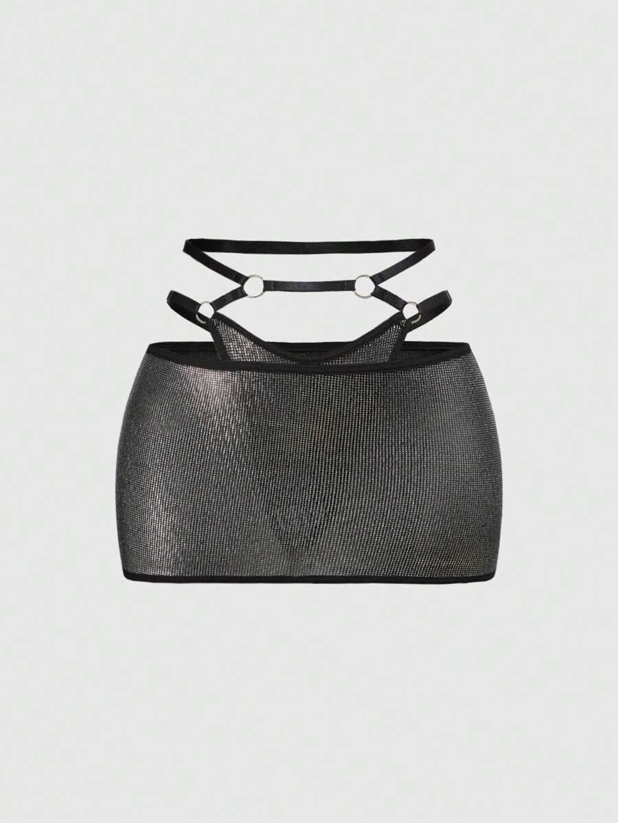Grunge Punk Gothic Punk Coated Fabric Strappy Star Bralette, Thong Panty, Mini Skirt Sexy Lingerie Set