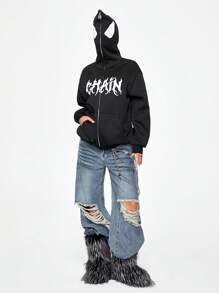 Grunge Punk Gothic Style Spider Print Oversized Zip-Up Hoodie For Women,Halloween
