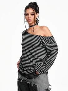 Grunge Punk Grunge Vintage Black Grey Striped Off-Shoulder Loose Long Sleeve T-Shirt For Women