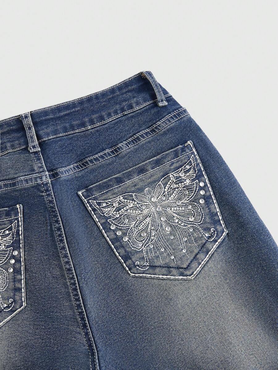 Grunge Punk J-Fashion Retro Y2K Low-Waist Butterfly Embroidery Adjustable Contrast Color Line Women's Denim Pants