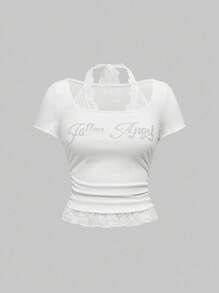 Grunge Punk Lace Splicing Rhinestone Decorated Letter Print Square Neck Fitted Women T-Shirt