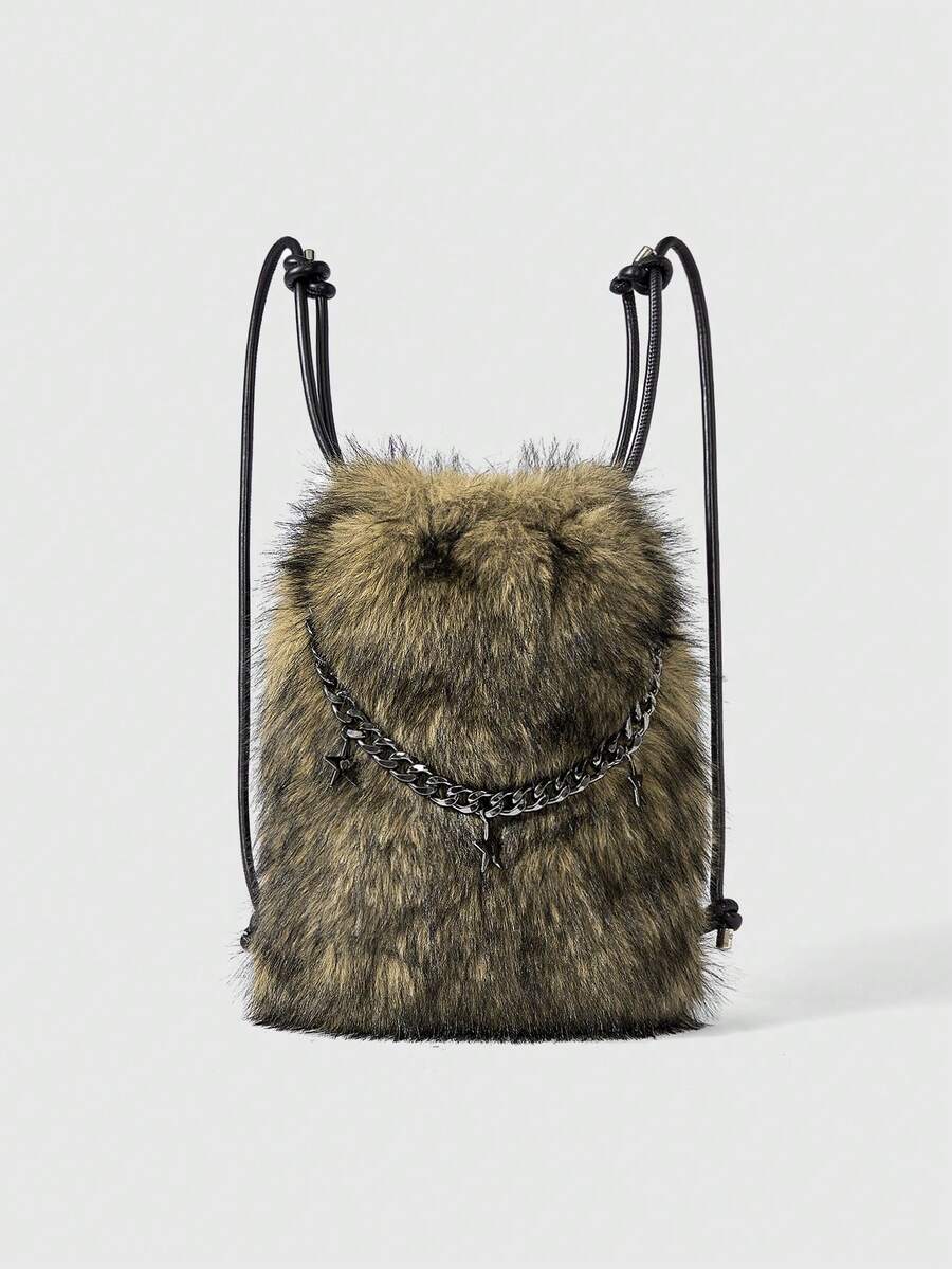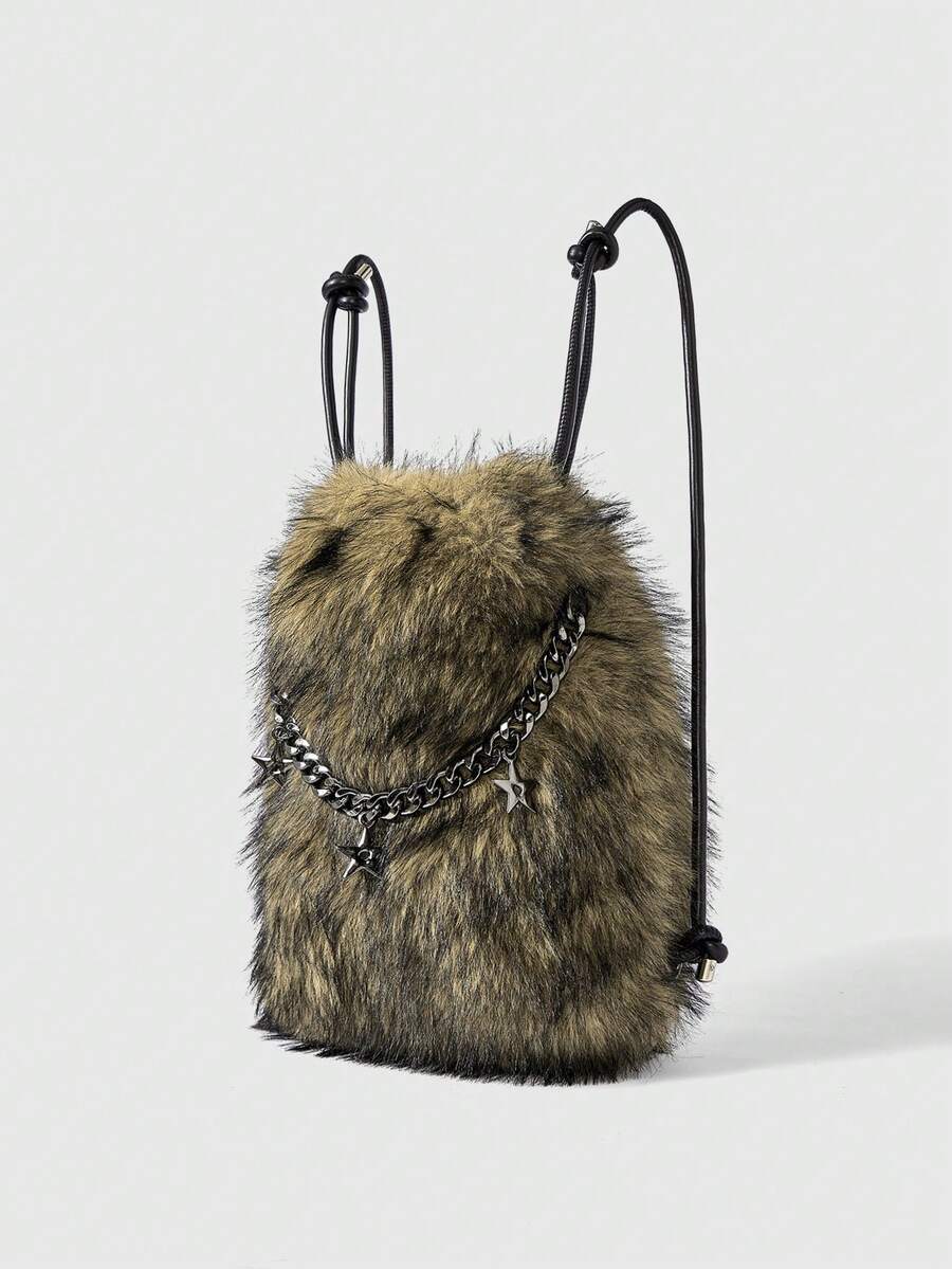 Grunge Punk Ladies,Women Backpack,Brown Purse,Plush,Plush Bag,Pendant Accessory,Bowknot Charm,Heart Charm,Metal Chain,Fashionable,Personality,Versatile,Shopping,Street,Sweet And Cool Girls,Hot Girls,Y2k,Punk,Daily,Autumn And Winter(Random Pattern)