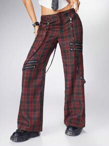 Grunge Punk Low Rise Plaid Flare Pants, Punk Rave Outfits For Music Festival