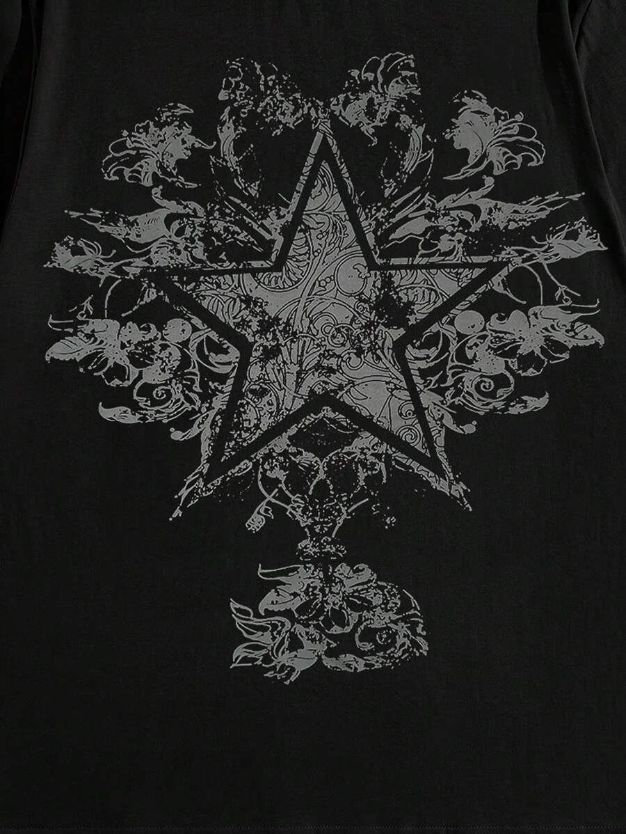 Grunge Punk Men Star & Floral Print Tee, School, 2000s Style