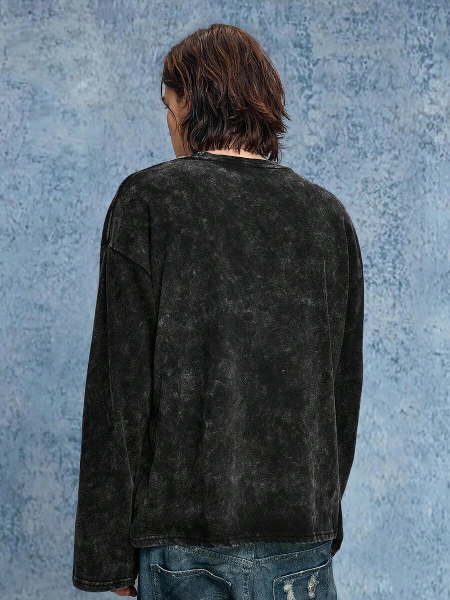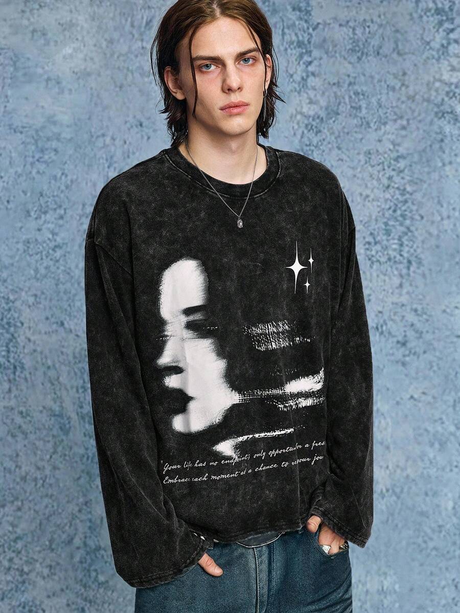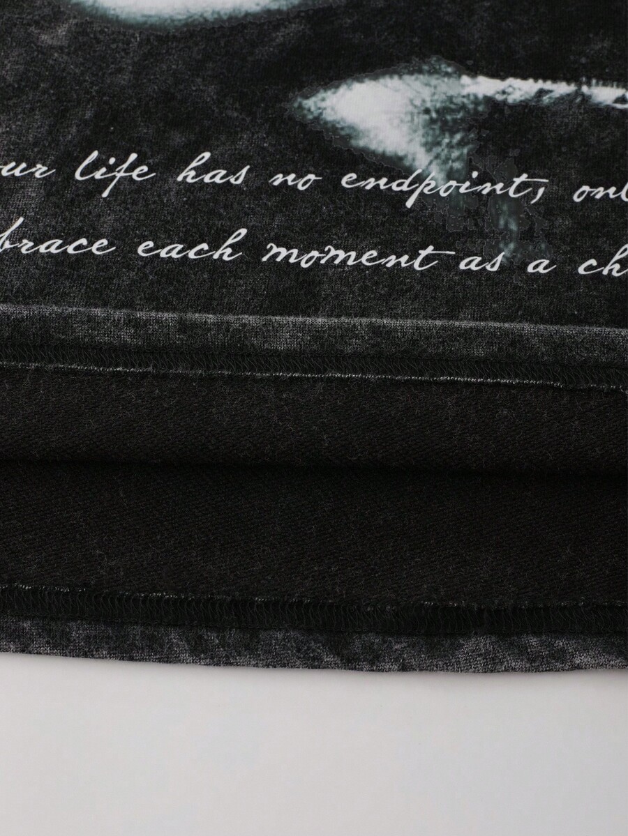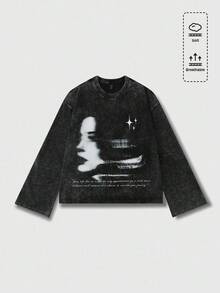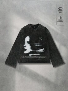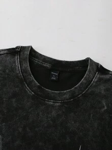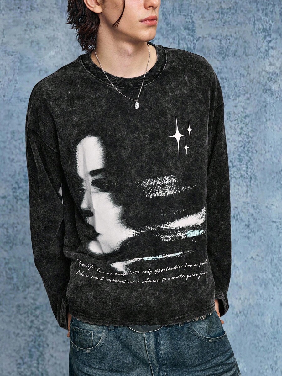 Grunge Punk Men Washed Character Print T-Shirt, Loose Cropped Style, Fall