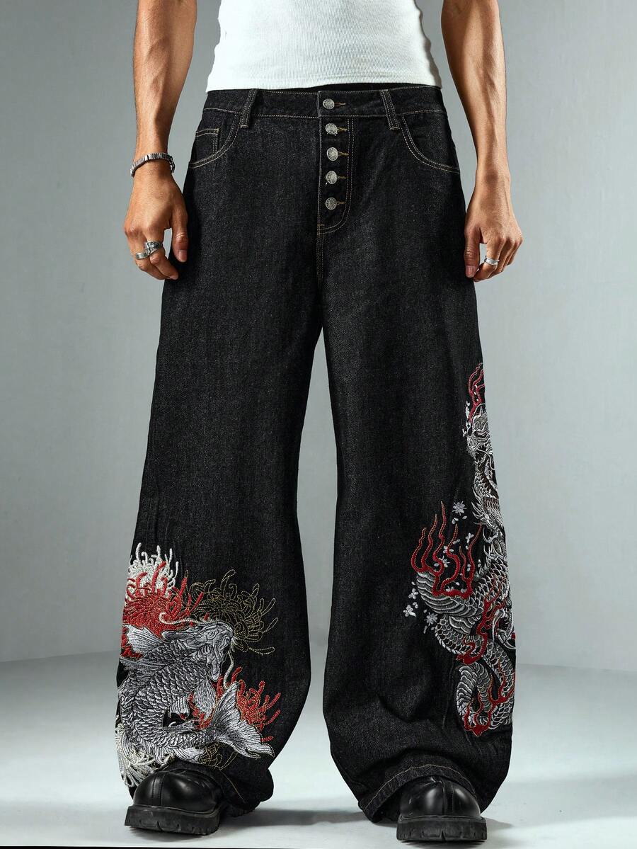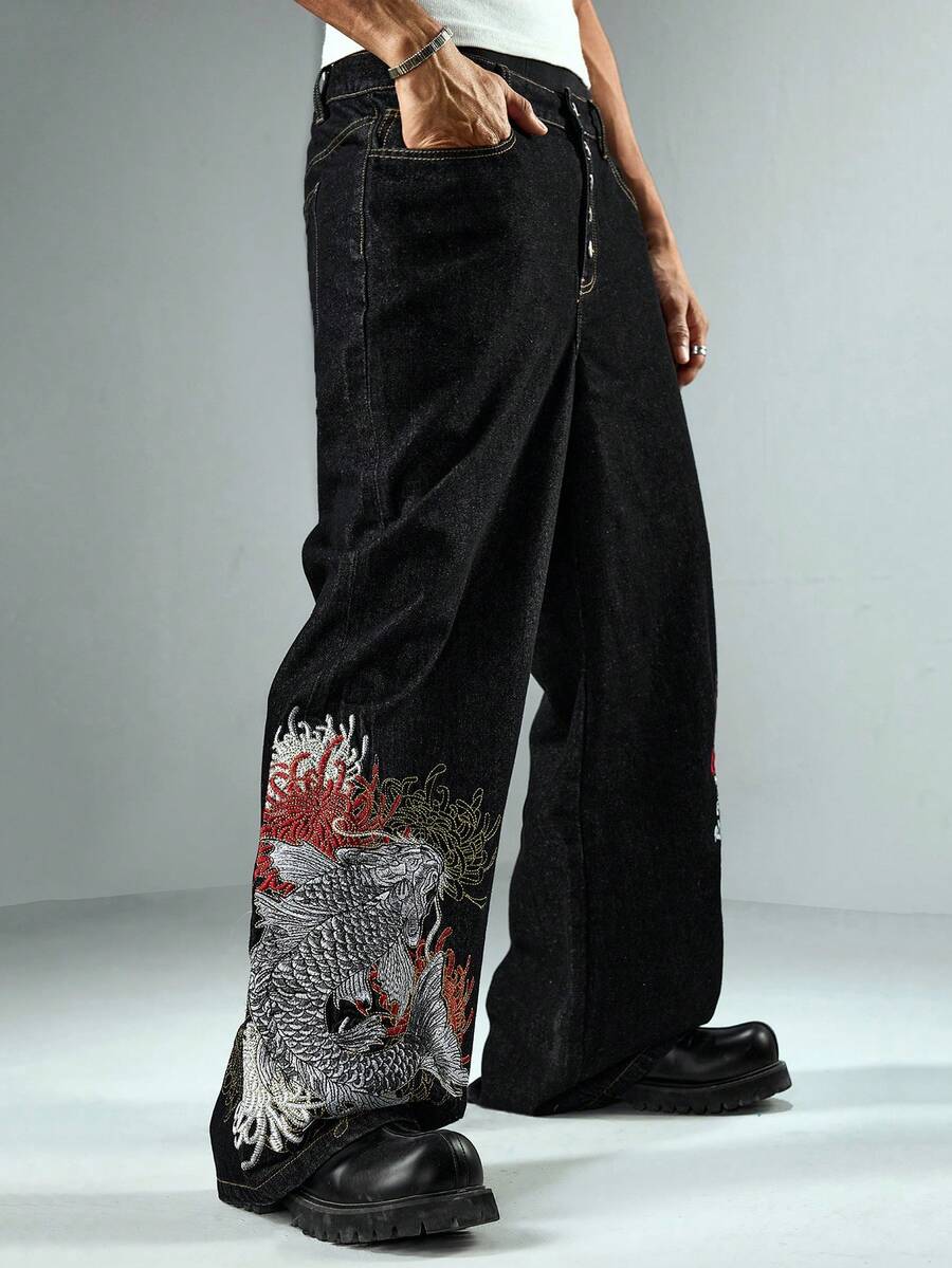 Grunge Punk Men's Casual Fashion Street Daily Commute Button Fly Koi Fish Floral Embroidery Loose Wide-Leg Jeans