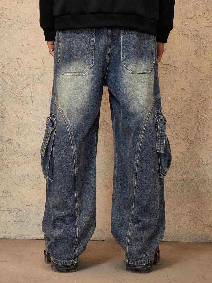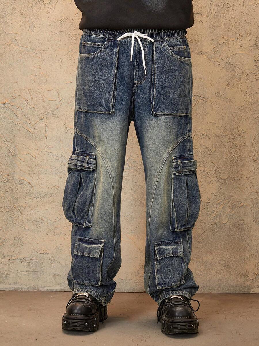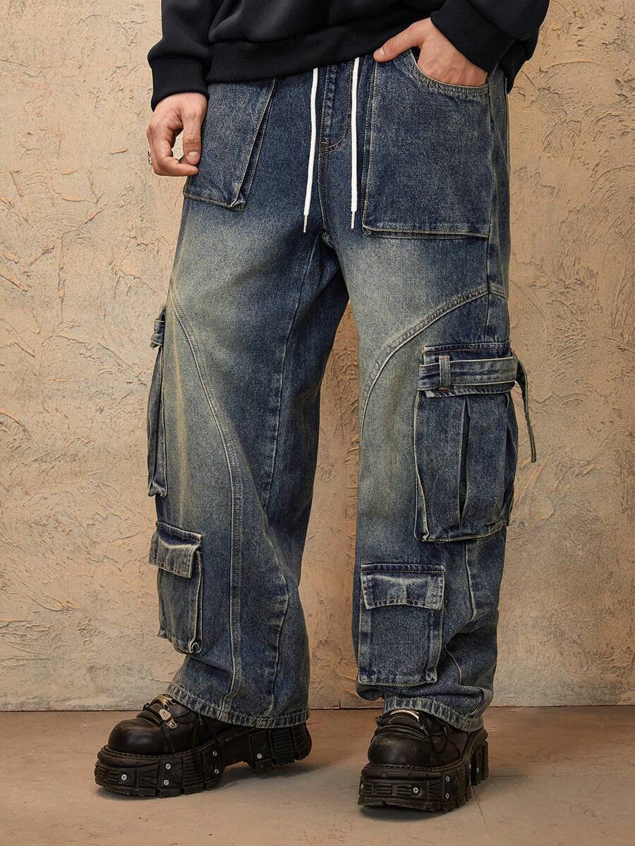 Grunge Punk Men's Casual Loose Water-Washed Drawstring Waist Multi-Pocket Loose Cargo Jeans, Fall