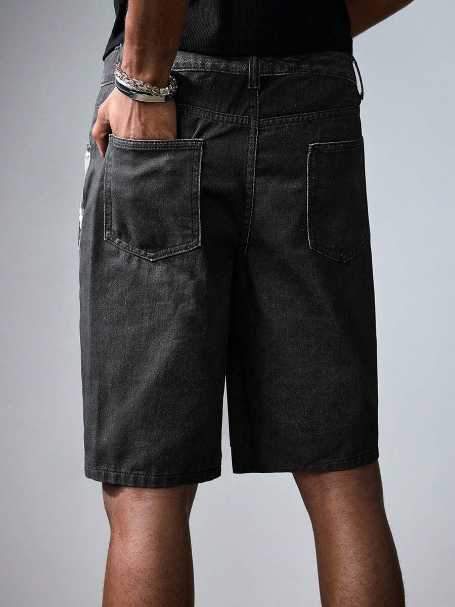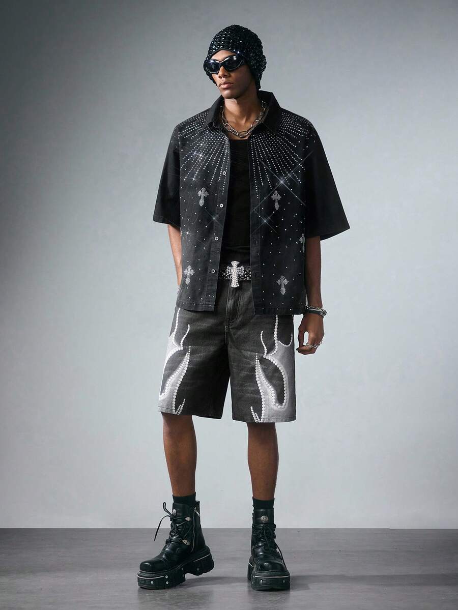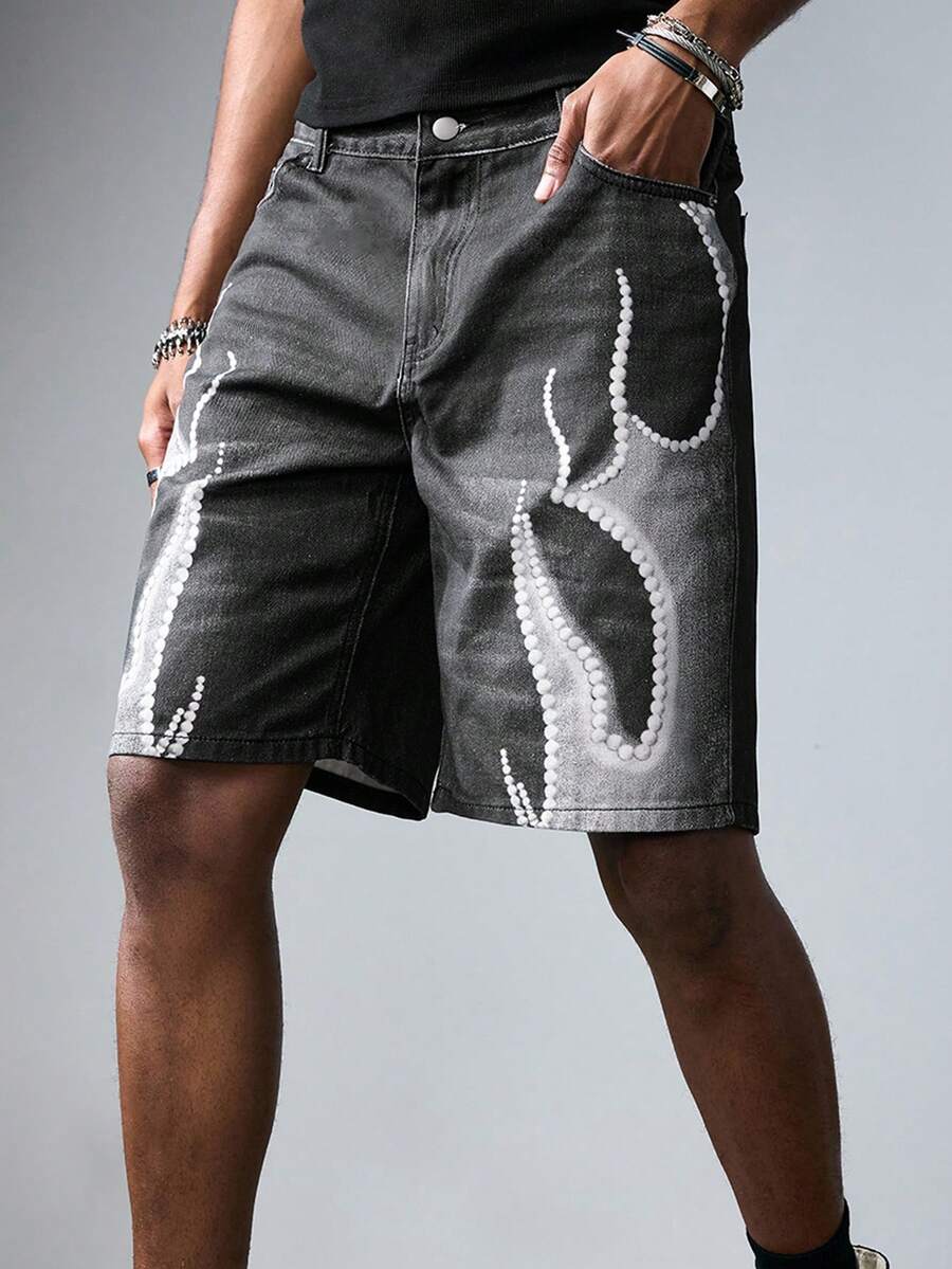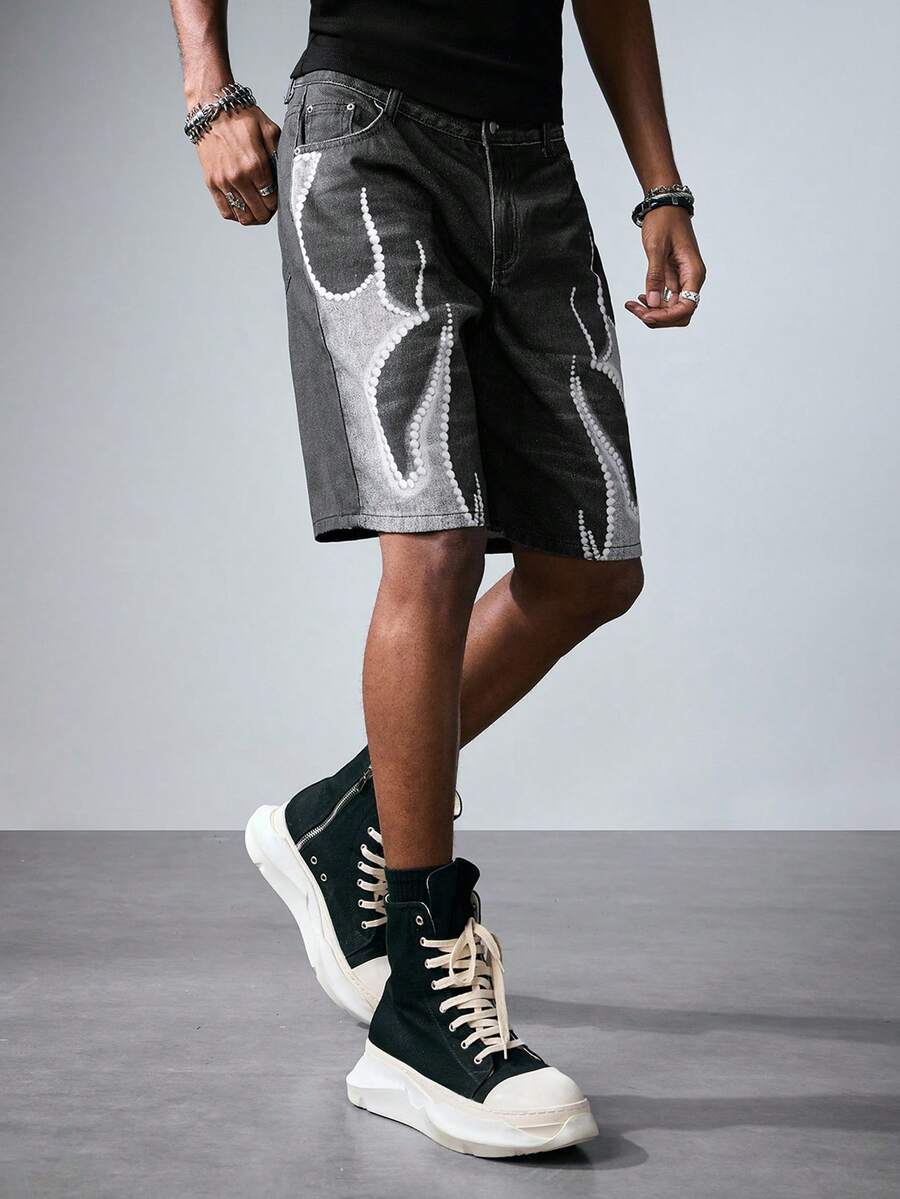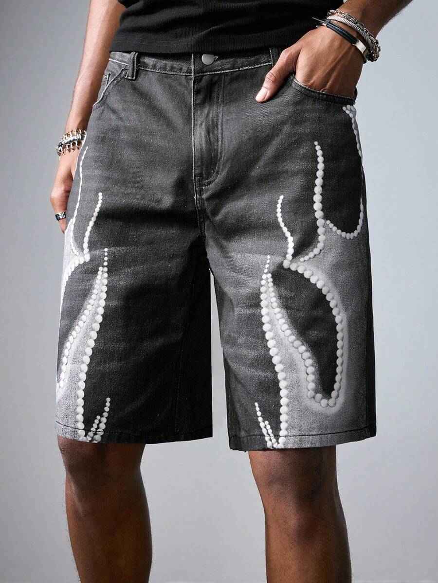 Grunge Punk Men's Gray Denim Shorts With Pockets, Digital Flame Print