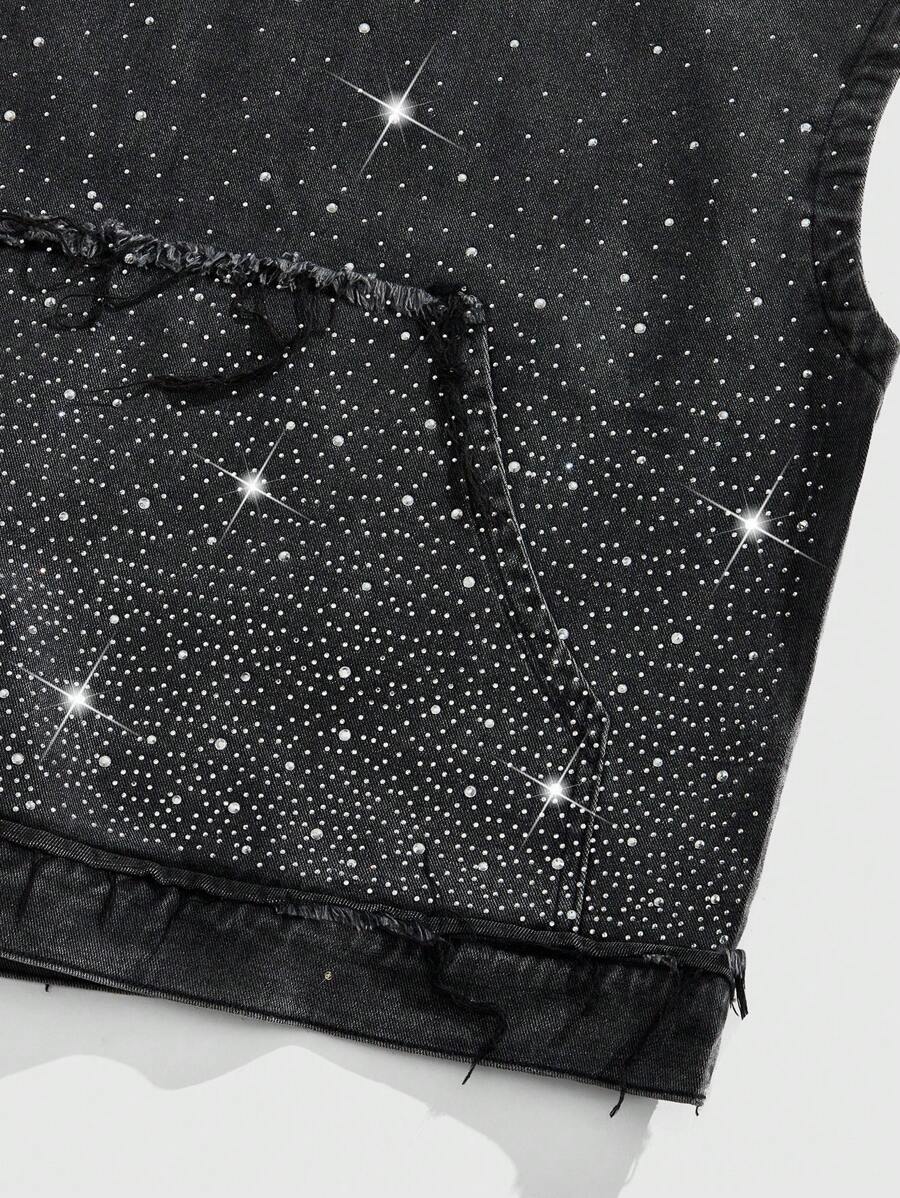 Street Life Men's Grunge Rhinestone Decor Hooded Sleeveless Denim Jacket With Pockets