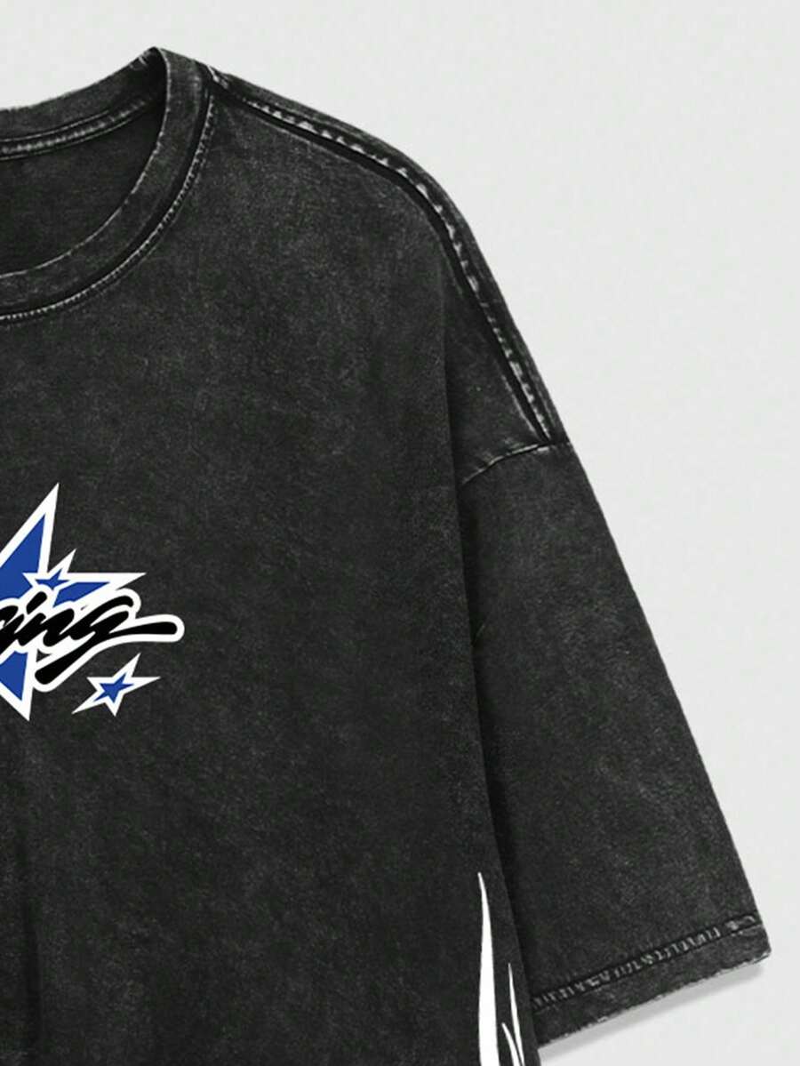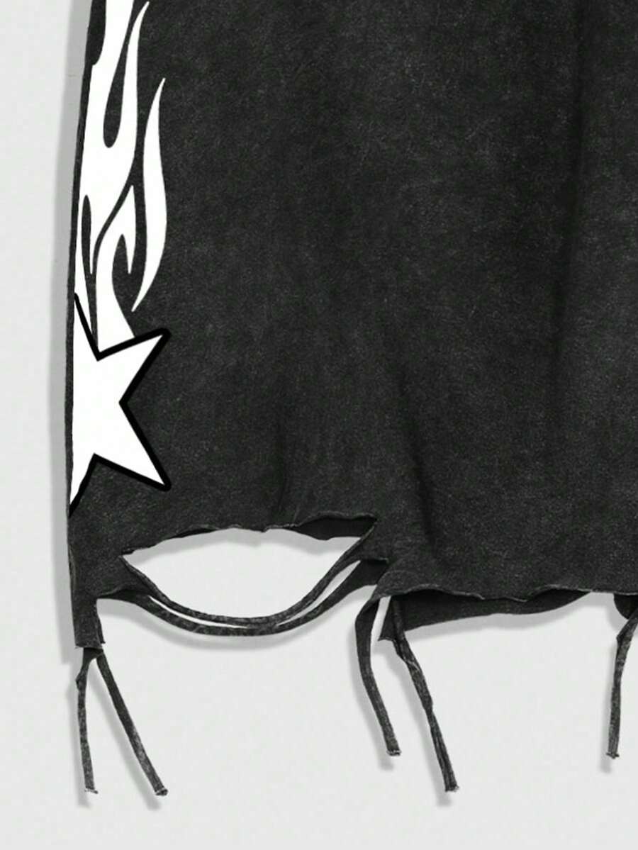 Grunge Punk Men's Loose Fit Cotton Letter & Star Flame Print Drop Shoulder Casual T-Shirt, Summer