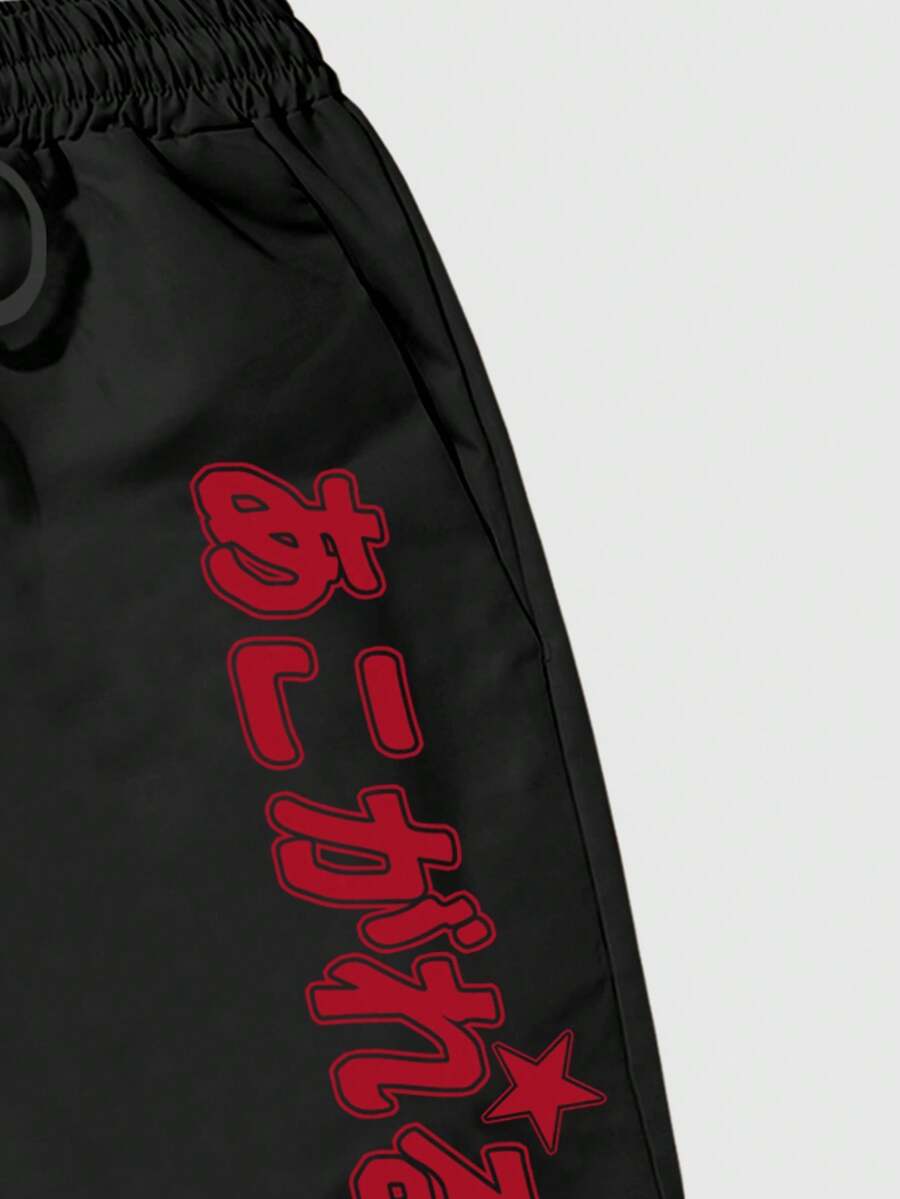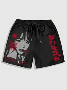 Grunge Punk Men's Slogan & Figure Graphic Drawstring Waist Fashionable Casual Shorts, School