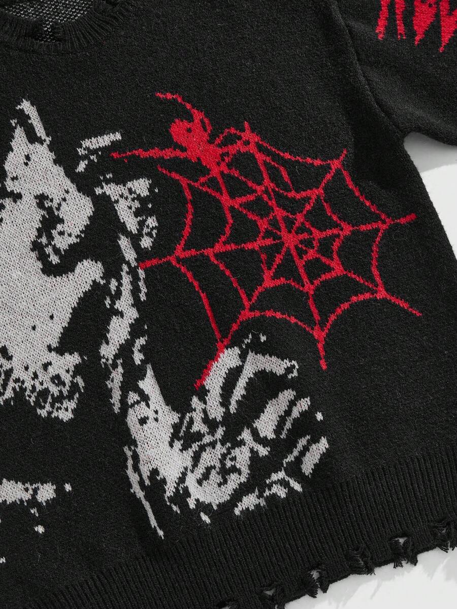 Grunge Punk Men's Spider Web Pattern Crew Neck Long Sleeve Casual Sweater, Autumn/Winter