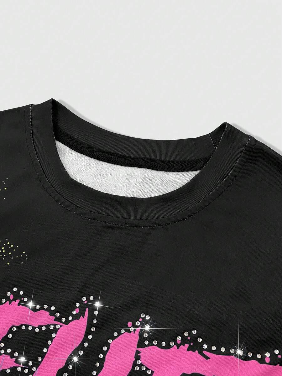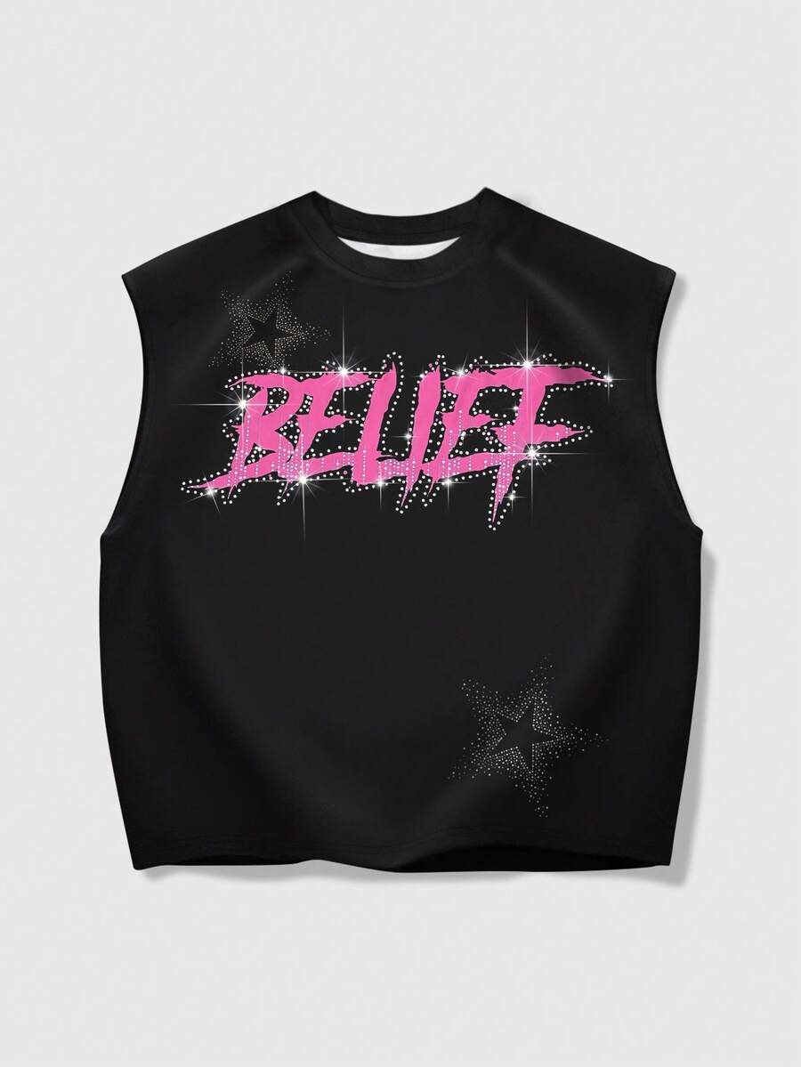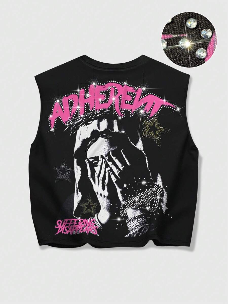 Grunge Punk Men's Summer Fashion Street Punk Style Virgin Mary Letter Print Rhinestone Embellished Loose Tank Top