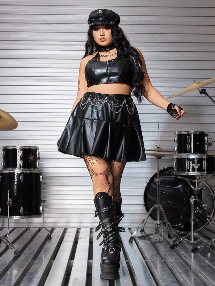 Grunge Punk Music Festival Punk Rivet Zip-Up Backless Sexy Black PU Plus Size Camisole & Tank Tops