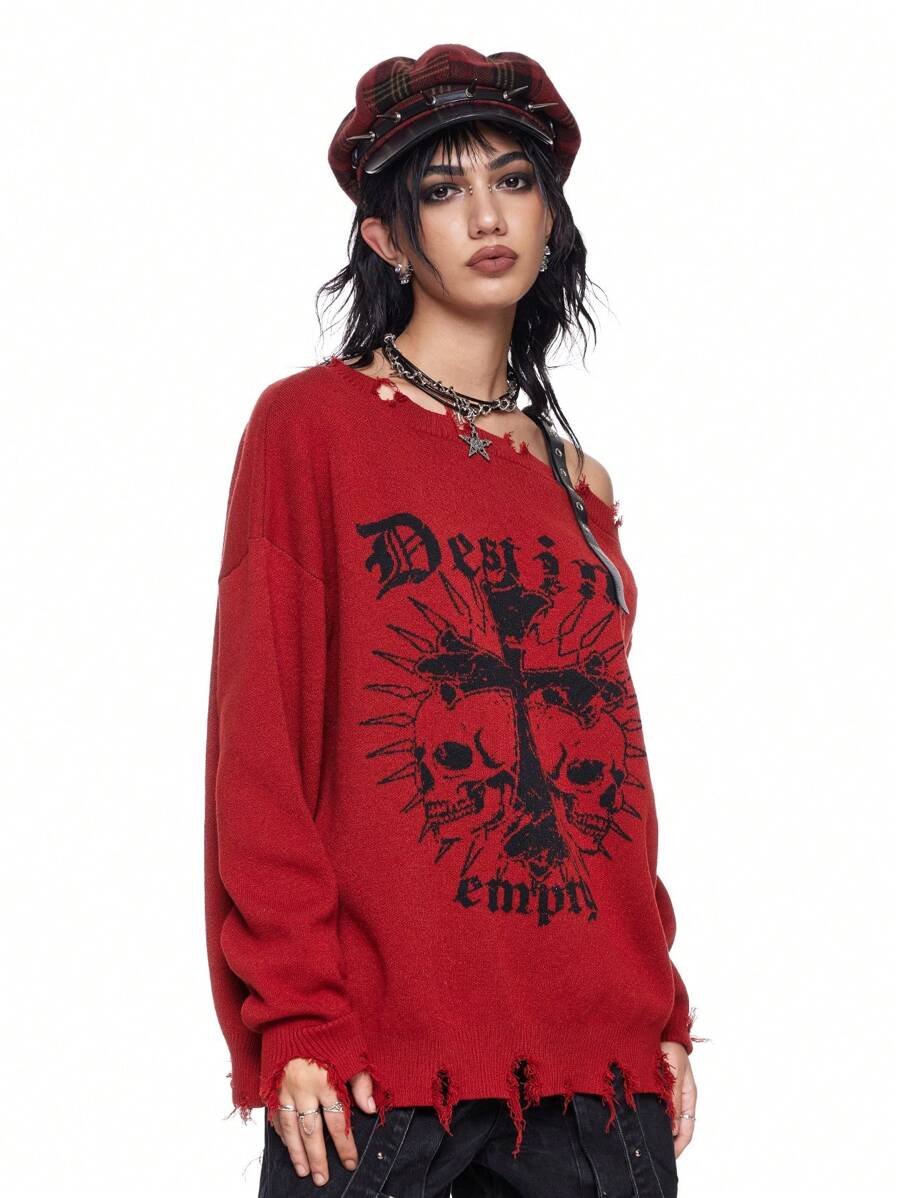 Grunge Punk New Year Holiday Asymmetrical Neck Cross Skull Music Festival Red Long Sleeve Raglan PU Sweater For Women
