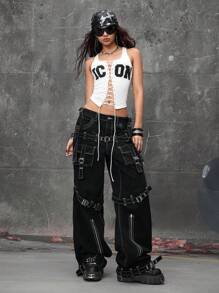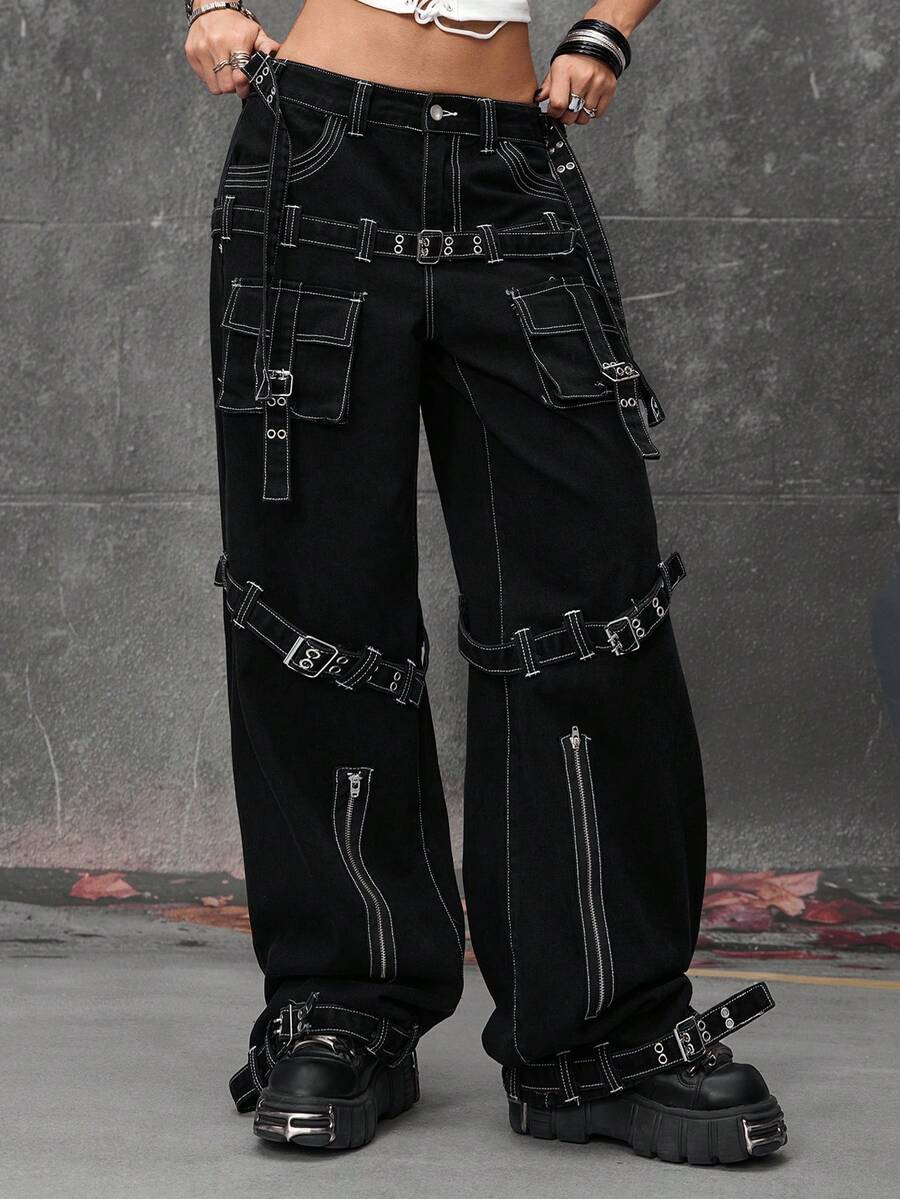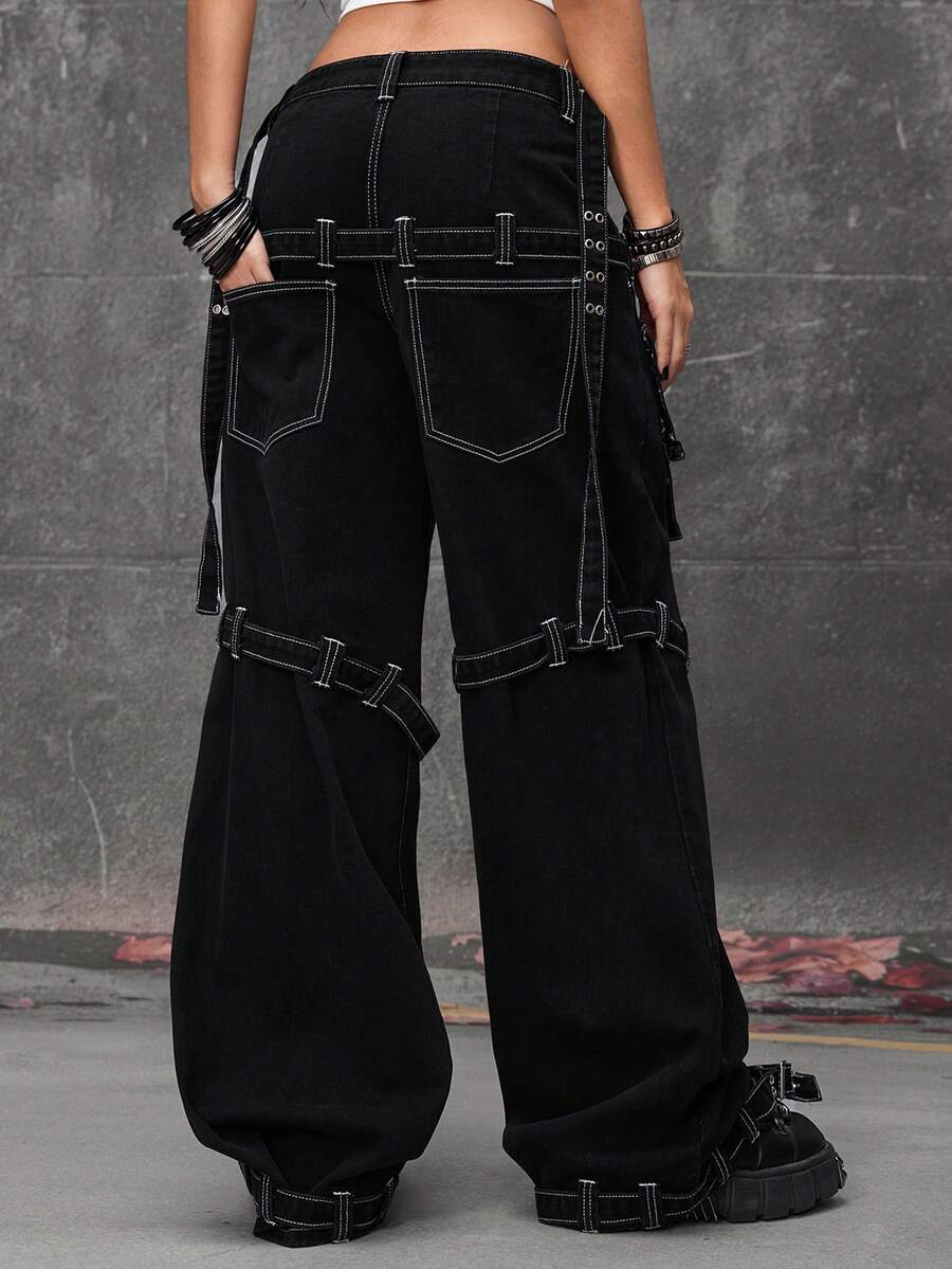 Grunge Punk Oversized Functional Eyelet Strap Design Wide Leg Cargo Jeans