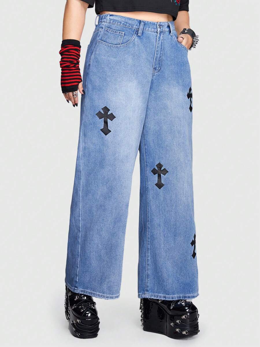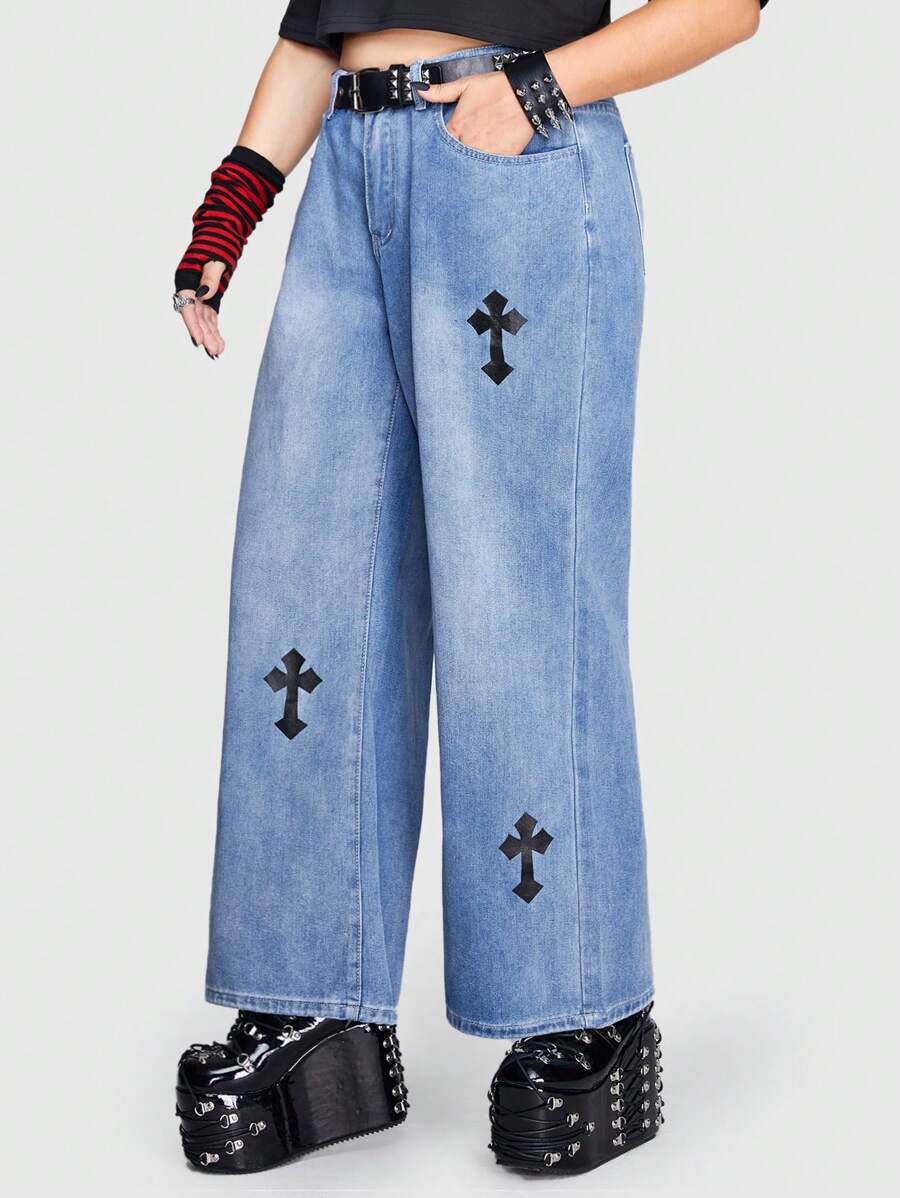 Grunge Punk Plus Cross Print Wide Leg Jeans