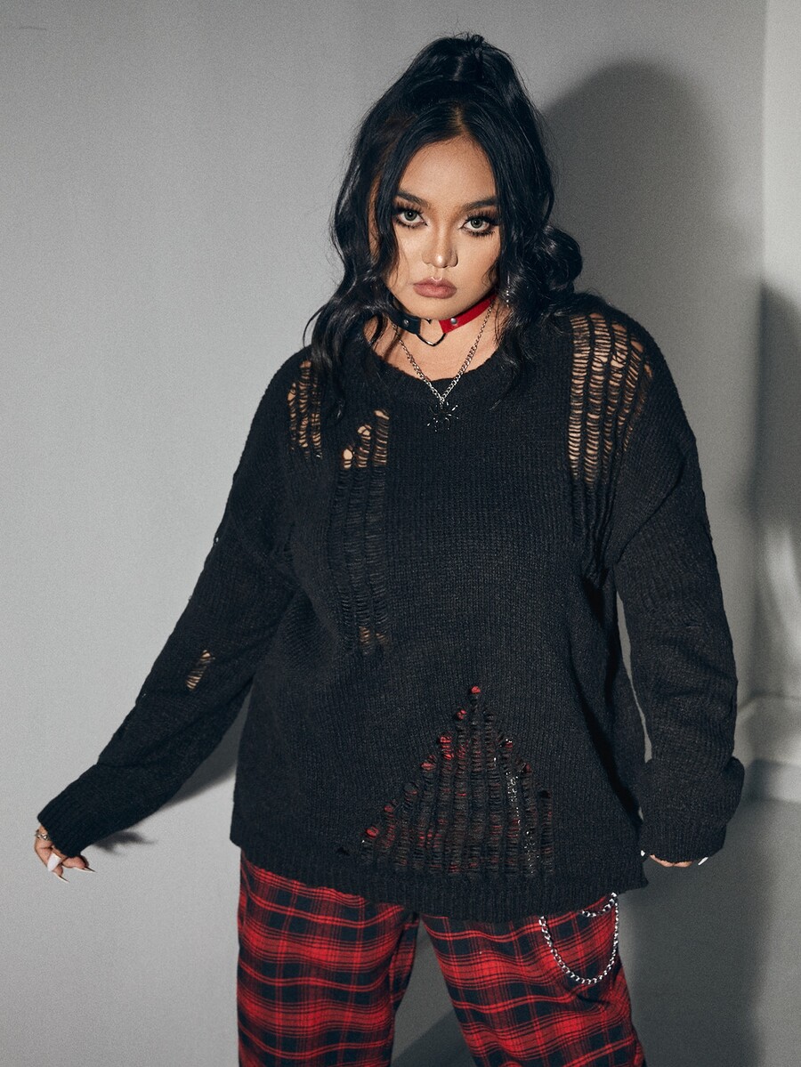 Grunge Punk Plus Distressed Drop Shoulder Sweater