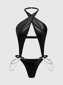 Grunge Punk Plus Size Dark Punk PU Leather Suspender Thong Bodystocking With Chain Details