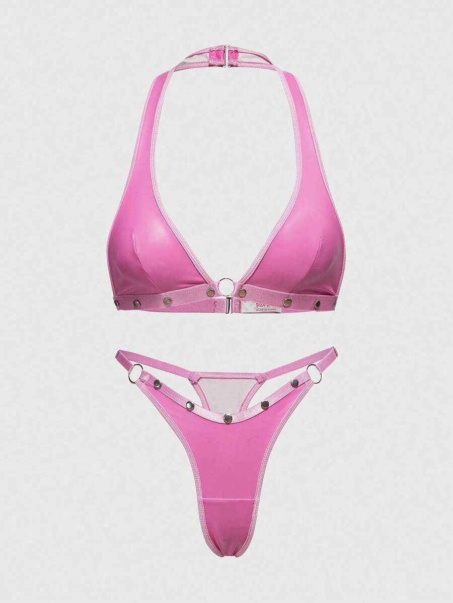 Grunge Punk Plus Size Dark Punk PU Studded Bralette And Thong Lingerie Set, Sexy Intimate Apparel