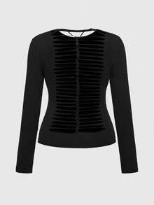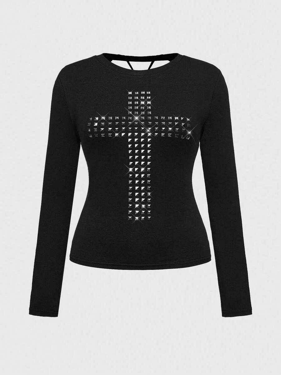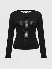 Grunge Punk Plus Size Gothic Cross Rhinestone Embellished Black Long Sleeve T-Shirt, Women Plus Size Tops, Autumn/Winter Gothic Casual Plus Size Women Kpop Long Sleeve Blouse
