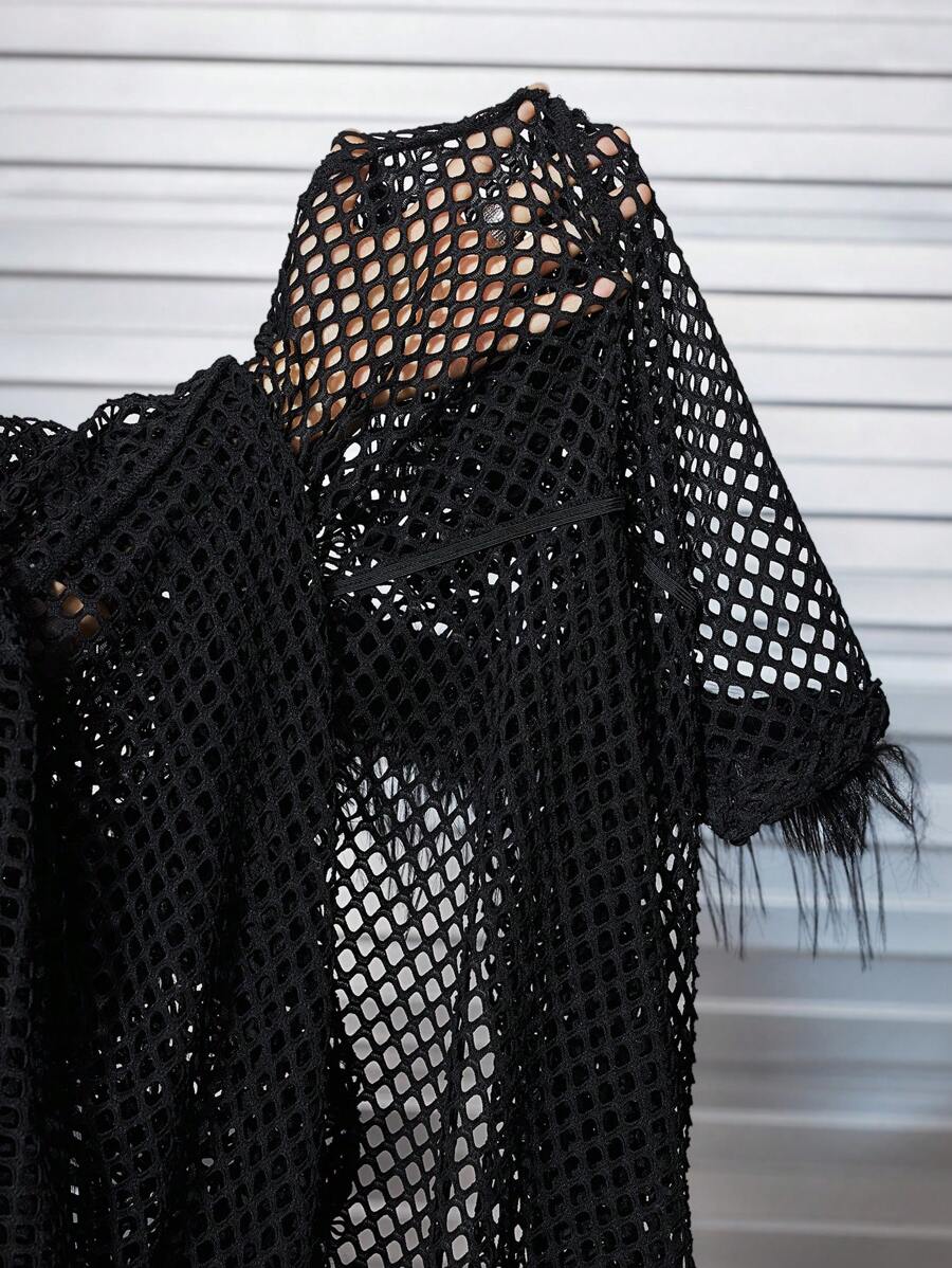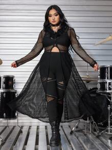 Grunge Punk Plus Size Women Black Mesh See-Through Long Sleeve Shirt, Lapel Collar, Sexy, Music Festival